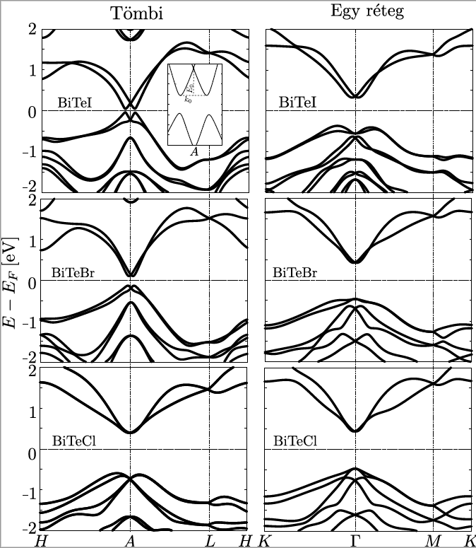 A dolgozatomnak további hiányossága, hogy a 3.2 ábrán látható sávszerkezetekben található tiltott sávok topologikus tulajdonságairól nem ejt szót. A munkánk során megvizsgáltuk mindhárom anyag tömbi és egyréteges szerkezetének topologikus invariánsát és mind a hat esetben azt találtuk, hogy a tiltott sávok triviálisak.