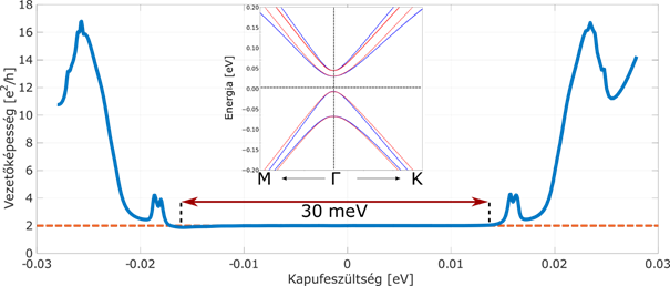 Az 4. ábrán látható elrendezésben vizsgáltuk a szendvics szerkezet elektromos tulajdonságát egy sűrűségfunkcionál elmélet eredményeihez illesztett szoros kötésű modellben az EQuUs szoftvercsomag segítségével, miközben egy képzeletbeli kapufeszültség hatását szimuláltuk azáltal, hogy változtattuk a rendszerben az onsite potenciált. Azt találtuk, hogy amikor a kapufeszültség értéke a tiltott sávban volt, akkor a rendszer vezetőképessége nem nullára megy le, hanem platót mutat, a 5. ábrának megfelelőlen. Ez a viselkedés a védett élállapotok jele.