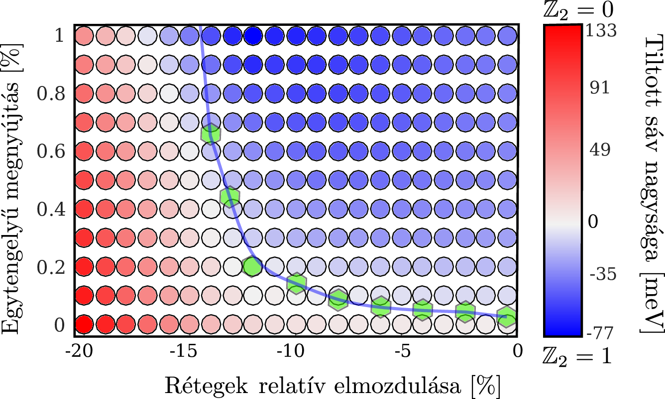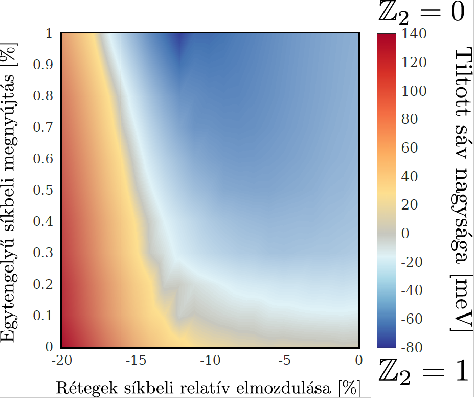- Milyen hőmérsékletre van szükség? A számolásaink során a 0,4%-os megnyúlás esetén a topologikus tiltott sáv nagysága eléri a 25 meV-t, sőt meg is haladja azt. A kísérlet szempontjából mindenképpen érdekes kérdés lenne, hogyan viselkedik az állapot a hőmérséklet függvényében, de a tiltott sáv nagysága alapján ekkora meghúzás esetén már szobahőmérsékleten is látható a jelenség. 0,2%-os megnyújtás esetén a tiltott sáv nagysága 12 meV, ami bőven a folyékony nitrogén hőmérséklete felett van, amivel a mintát hűteni lehetne.