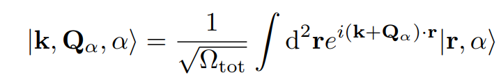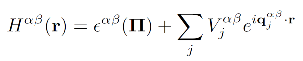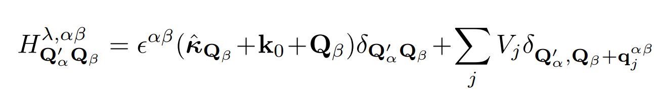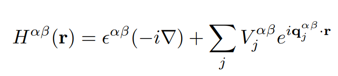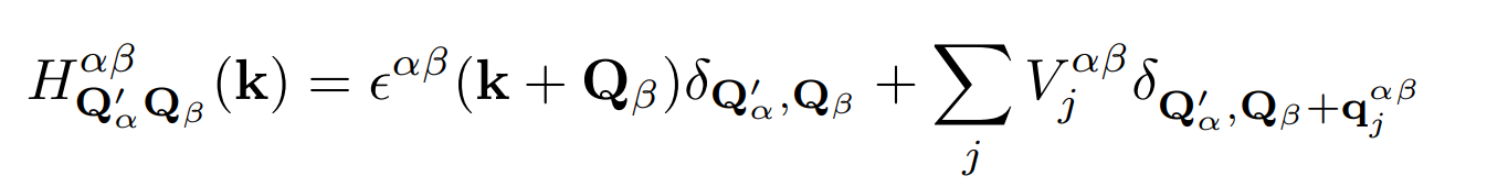 \( V^{\alpha, \beta}_j \mathrm{e}^{i\mathbf{q}_j^{\alpha, \beta}\cdot \mathrm{r}} \) is diagonal in quantum numbers \( \lambda \) and \( n \) when acting on the basis, while changes the orbital from \( \beta \) to \( \alpha \), and shifts the reciprocal momentum \(\mathbf{Q}_\beta \) to \(\mathbf{Q}_\beta + \mathbf{q}_j^{\alpha, \beta} \).