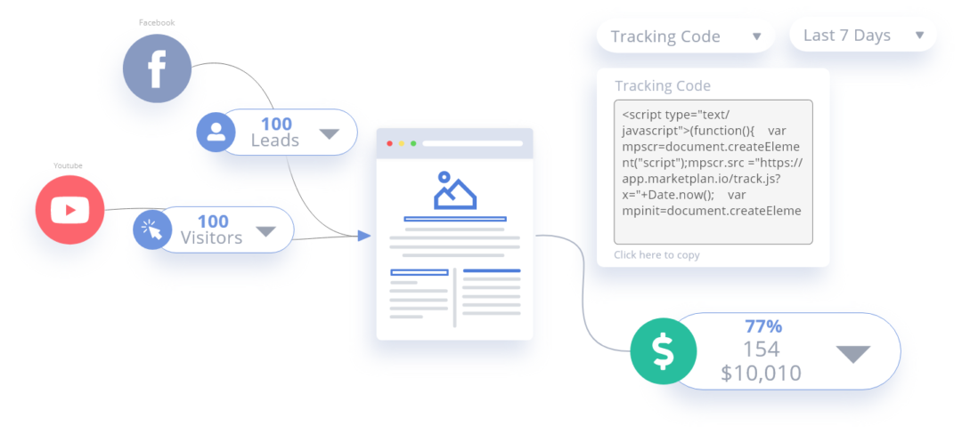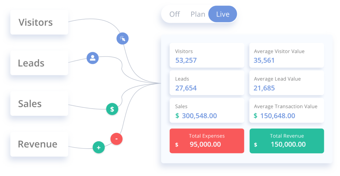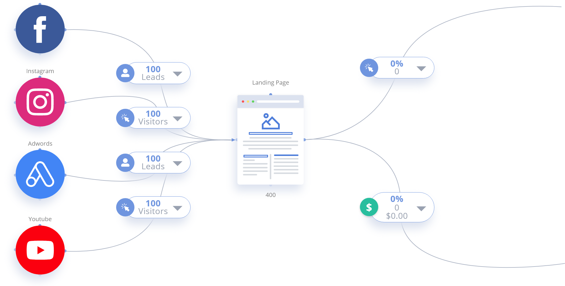 Canvas para desenho de um funil visual de atração de leads e conversão de vendas, com cálculos de projeções e análises de retorno sobre o investimento de campanhas, em tempo real.