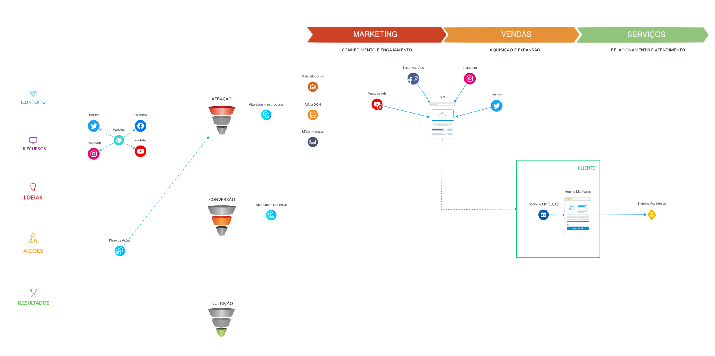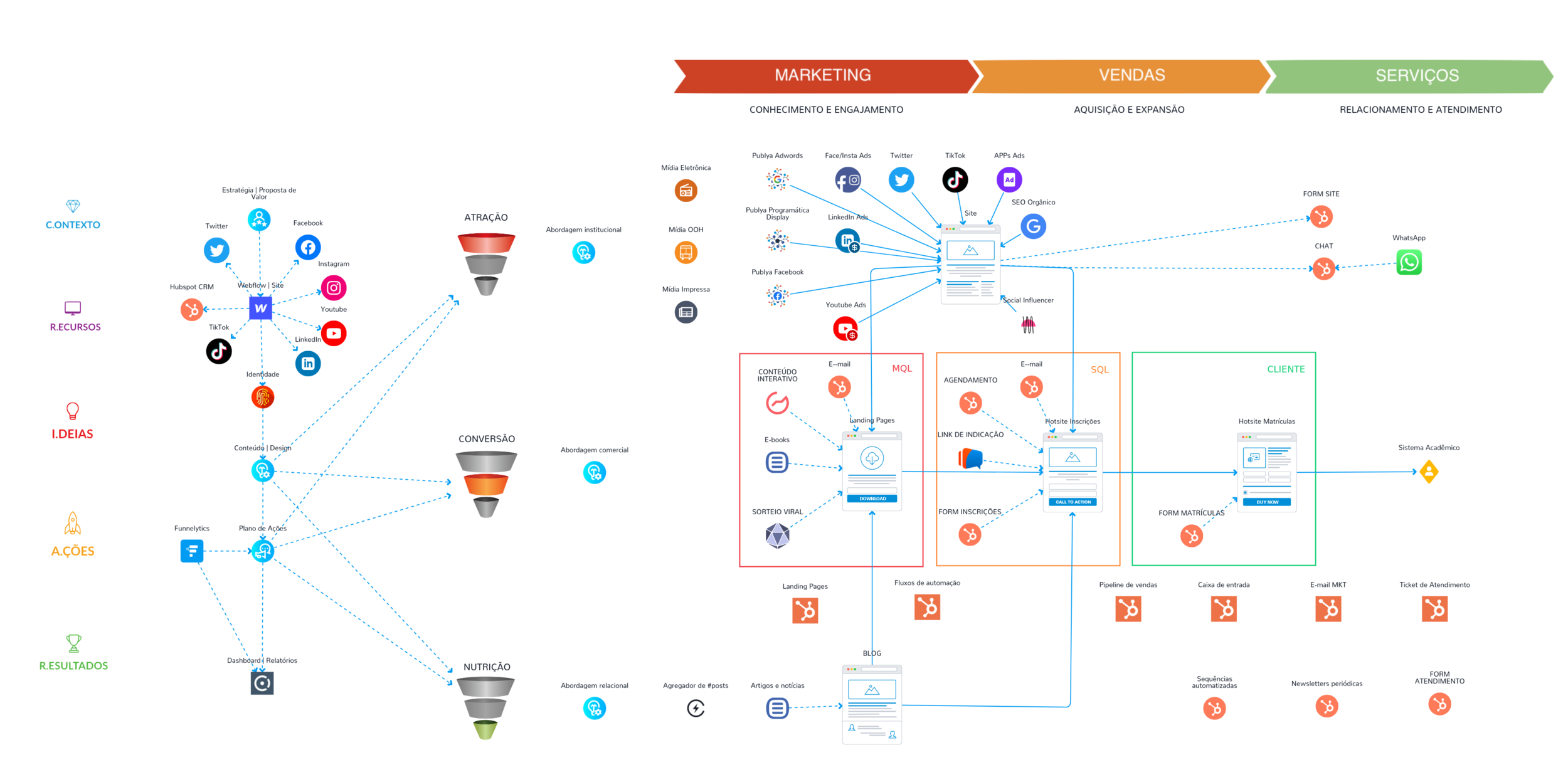 O modelo atual, baseado na metodologia C.R.I.A.R. propõe um processo de qualificação de LEADS na instância do CRM (sistema de marketing, vendas e relacionamento), com geração de audiência, qualificação de leads de marketing (MQL), conversão em leads de venda (SQL) e, após relacionamento com esta base, conversão final de CLIENTES, que são matriculados no ERP (sistema acadêmico).