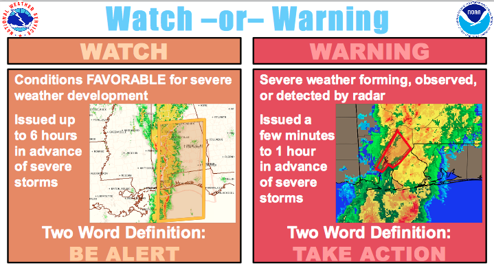 What is the difference between a "watch" and a "warning" during severe weather?
