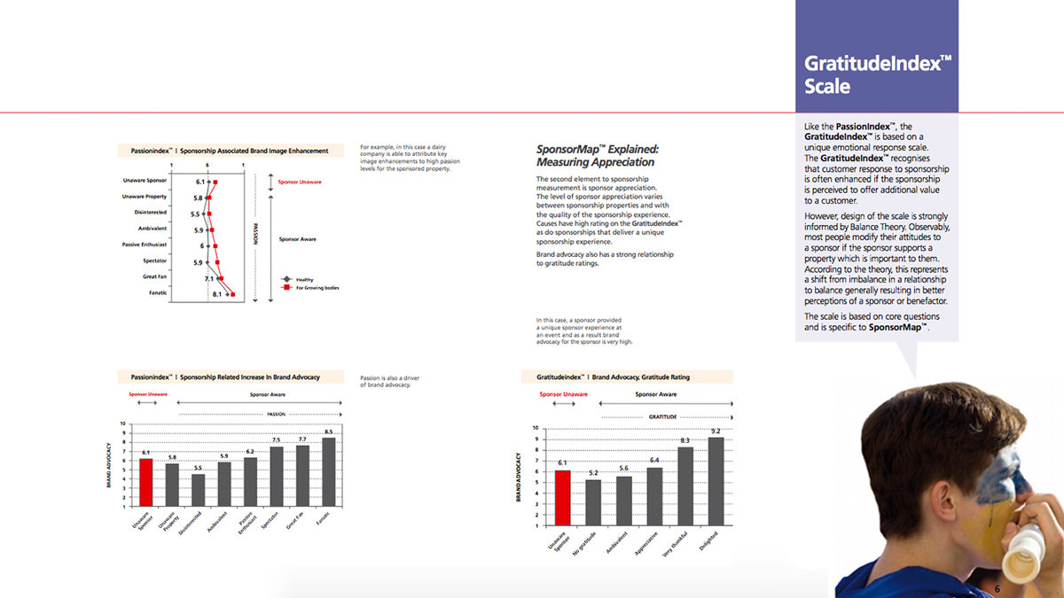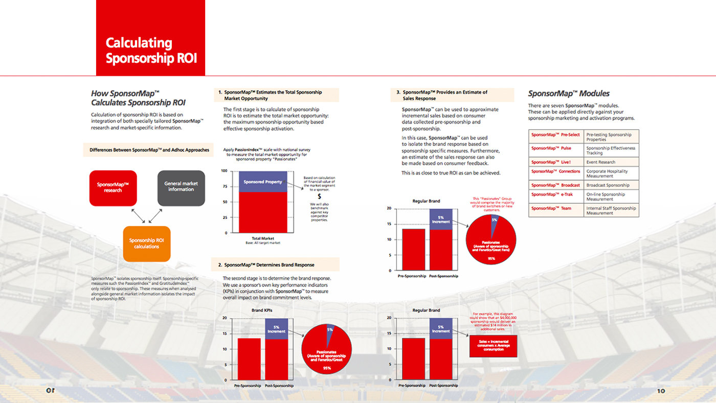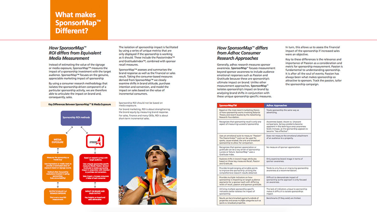 SponsorMap es una herramienta de investigación del consumidor diseñado específicamente para medir, en particular los complejos elementos de la marca de patrocinio/ propiedad relación / consumidor. Mide los cinco ingredientes esenciales en cualquier patrocinio: atención, compresión, compromiso emocional, aprecio y compromiso.