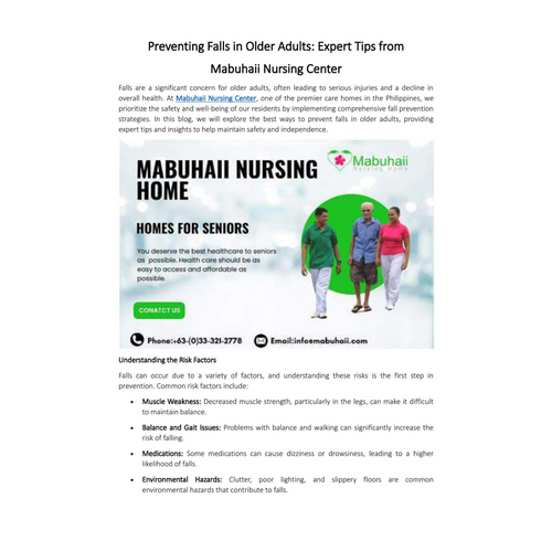 Mabuhaii Nursing Home is a premier eldercare nursing home in the Philippines offers top-tier residential care for seniors, ensuring comfort, safety, and dignity. With a compassionate team of skilled caregivers, we provide personalized attention, medical assistance, and recreational activities tailored to each resident's needs. Our state-of-the-art facilities prioritize wellness and social engagement, fostering a vibrant community where elders thrive. From nutritious meals to round-the-clock support, we are dedicated to enhancing the quality of life for our cherished seniors, creating a warm and nurturing environment they can call home. https://www.nursing-home-philippines.com/services