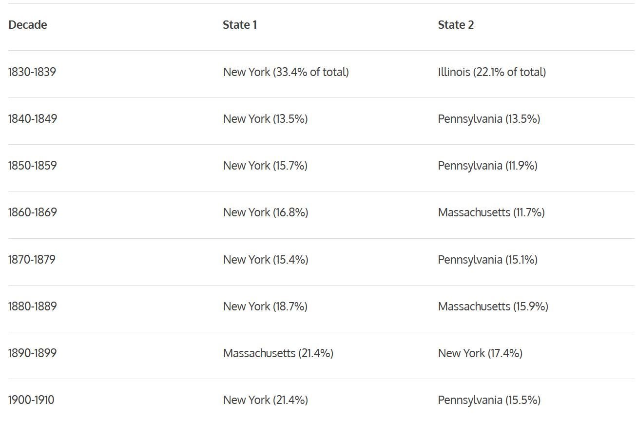 Top States, Proportion of Irish-Born Population Claiming Irish as Mother Tongue, by Decade of Arrival, as per 1910 Census
