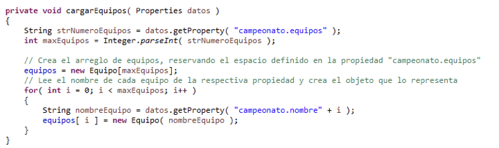 - Por último si se llama al método cargarEquipos que recibe como parámetro un objeto de tipo Properties.