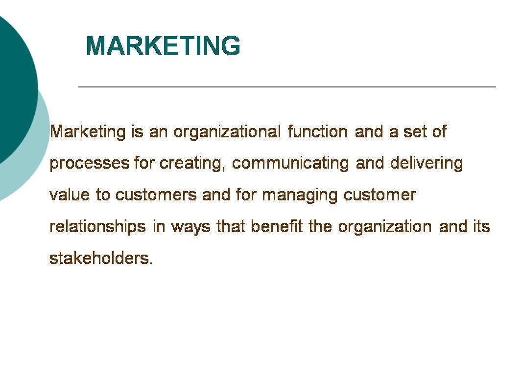 Marketing is an organizational function and a set of processes for creating, communicating and delivering value to customers and for managing customer relationships in ways that benefit the organization and its stakeholders.