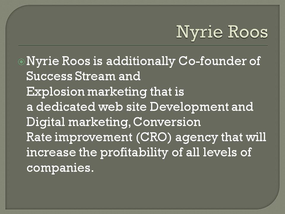 Nyrie Roos became obsessed with mastering Marketing, Website Development, Sales Funnel and Landing Pages, Lead Generation, Attraction and Influencer marketing. She is also Co-founder of Explosion Marketing and Success Stream.