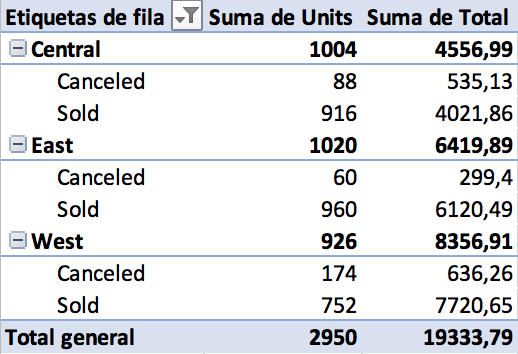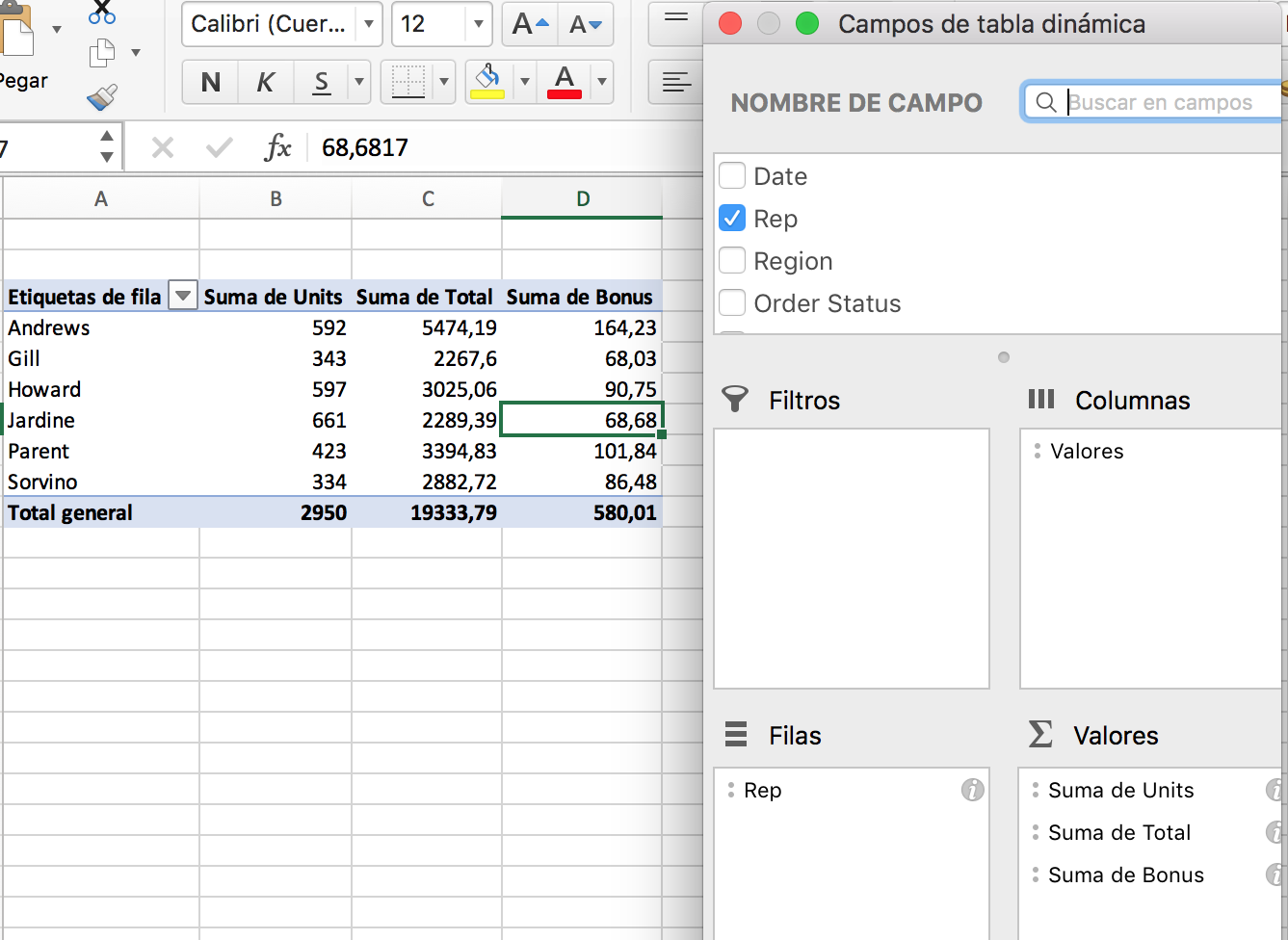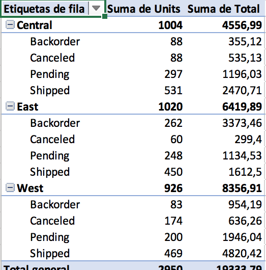 Los elementos calculados se incluyen en la misma lista que el resto de elementos del área "Filas" o "Columnas" de la tabla dinámica.