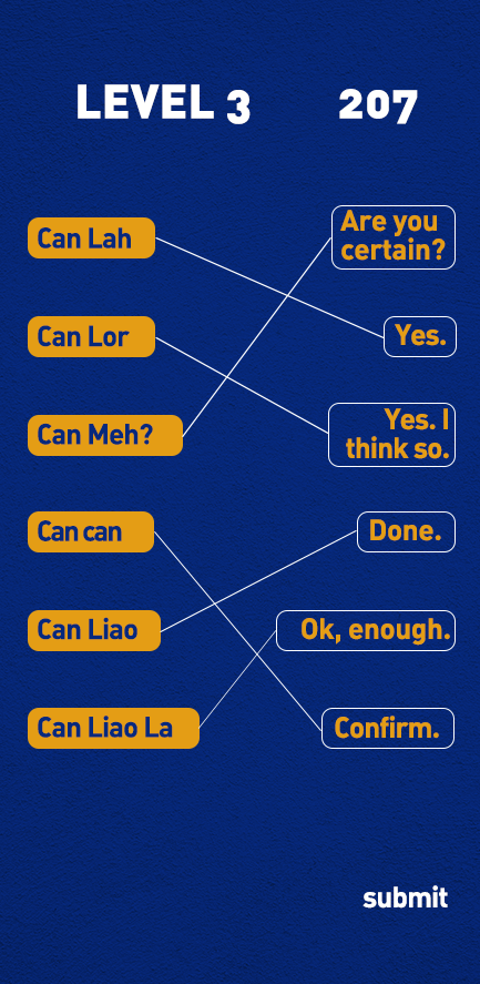 The language of 'Can' in Singlish with different meaning. Player is required to match the title to its correct meaning (60s)