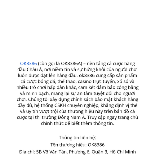 OK8386 (còn gọi là OK8386A) – nền tảng cá cược hàng đầu Châu Á, nơi niềm tin và sự hứng khởi của người chơi luôn được đặt lên hàng đầu. ok8386 cung cấp sản phẩm cá cược bóng đá, thể thao, casino trực tuyến, xổ số và nhiều trò chơi hấp dẫn khác,