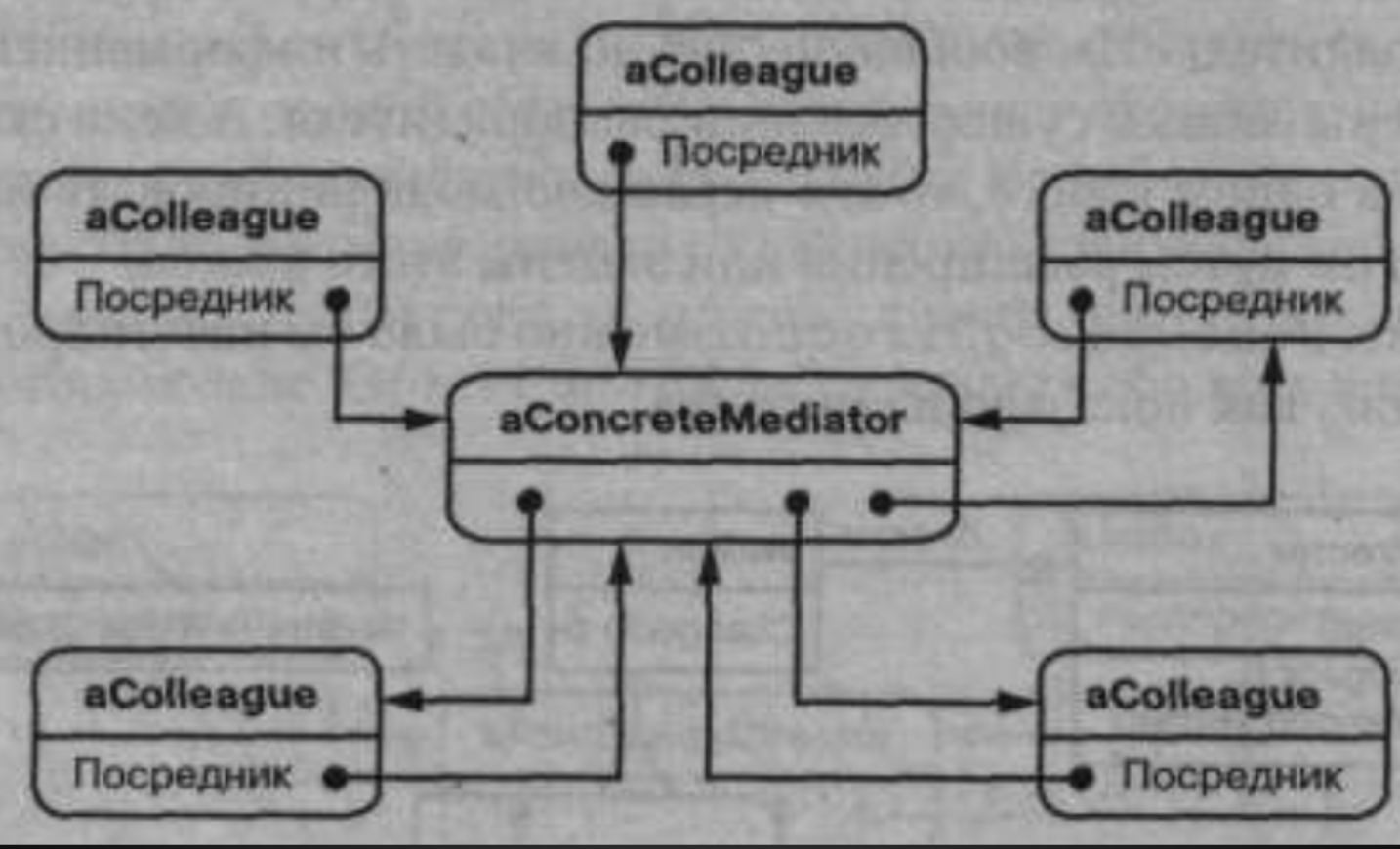 Коллеги посылают запросы посреднику и получают запросы от него. Посредник реализует кооперативное поведение путем переадресации каждого запроса подходящему коллеге (или нескольким коллегам).