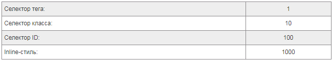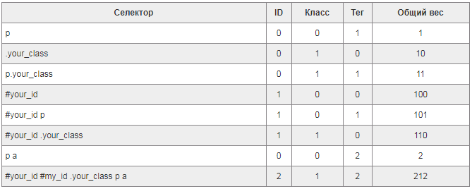 Какие источники являются более значимыми, а какие – менее? Разобраться в этом поможет эта таблица, где указан вес (значимость) каждого селектора. Чем больше вес, тем выше приоритет: