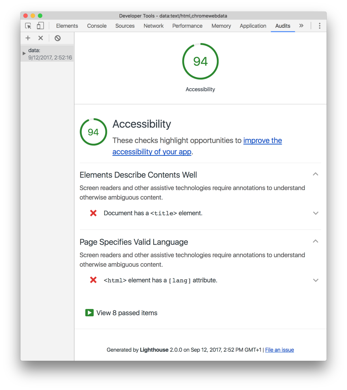 The audits tab in Chrome's dev tools now runs Google's new Lighthouse tool. This will run through the page and highlight any potential accessibility issues.