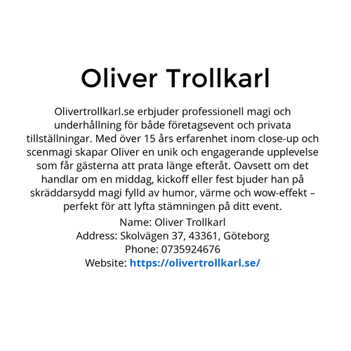 https://olivertrollkarl.se/ Professionell trollkarl som bjuder på magi, underhållning och oförglömliga upplevelser för både företag och privata evenemang.