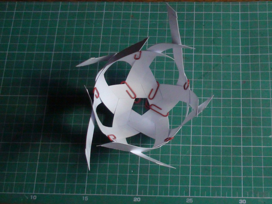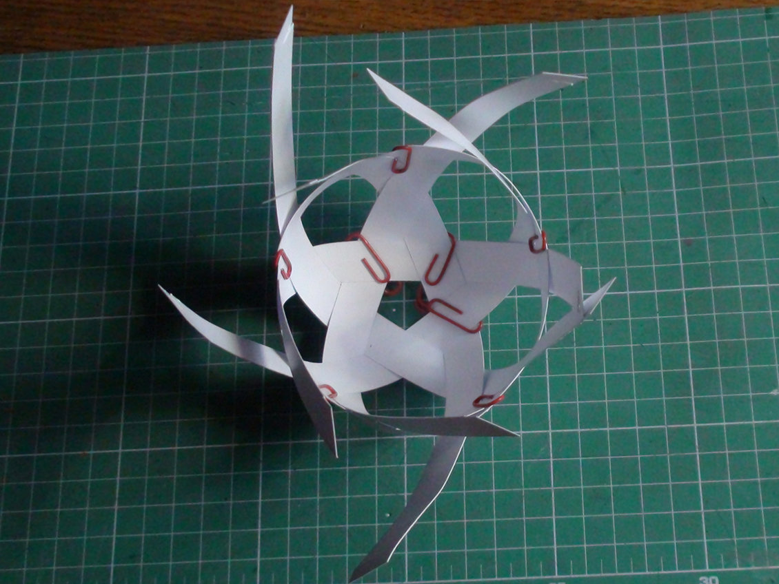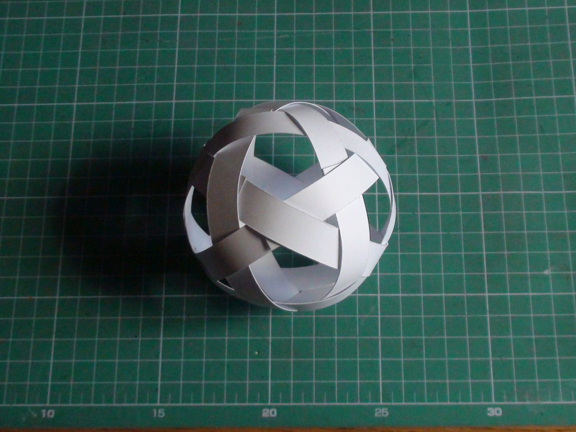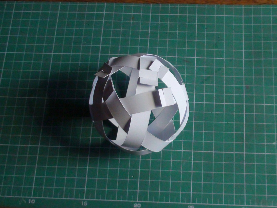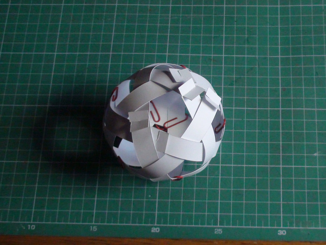 Завершим сборку шара, прокручивая кольца таким образом, чтобы "замки" скрылись под перекрывающими их полосками.