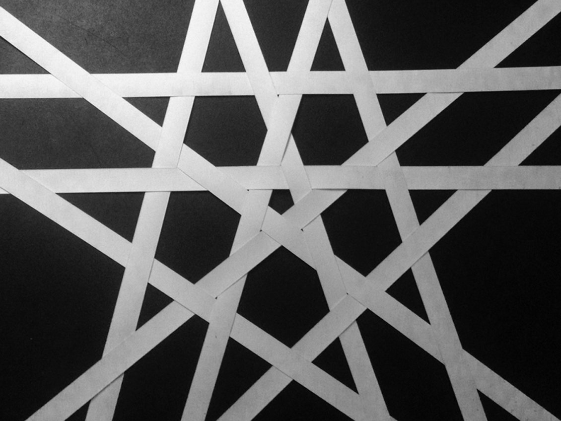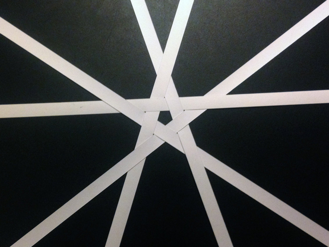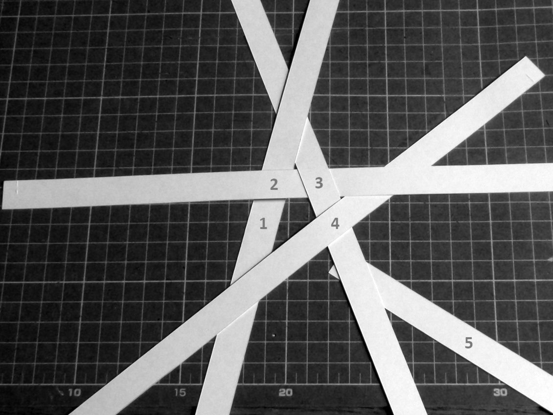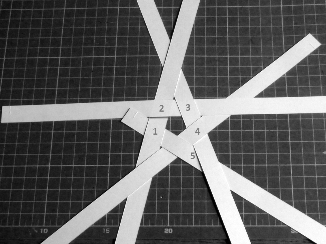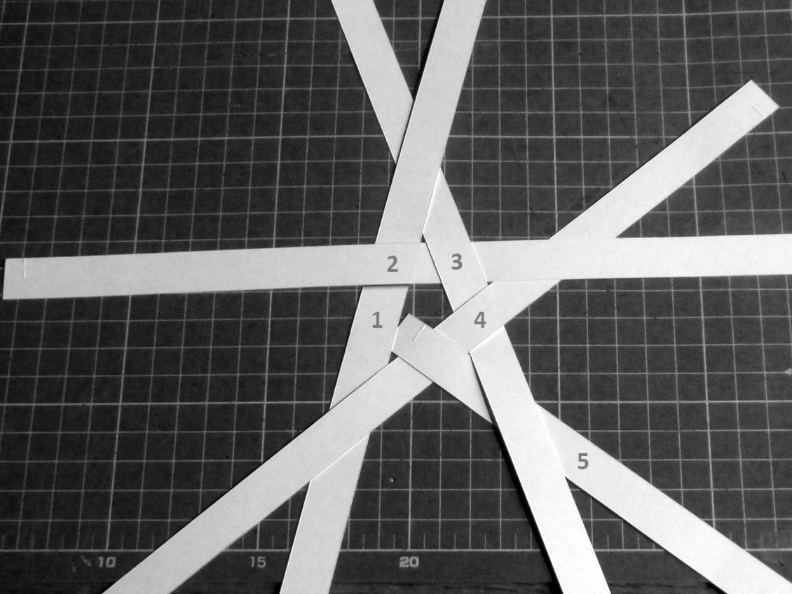 Разместим ещё 5 полосок так, чтобы вокруг центральной звездочки получилось 5 шестиугольников , а на её концах образовались "правильные" узлы.
