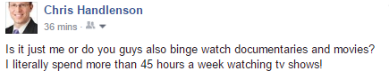 As part of my previous yougov research, i found out that people who like films similar to our genre i.e donnie darko usually watch more than 40 hours of tv shows or films per week. As you can see below, Chris suits our target audience as he also watches a similar amount of hours.