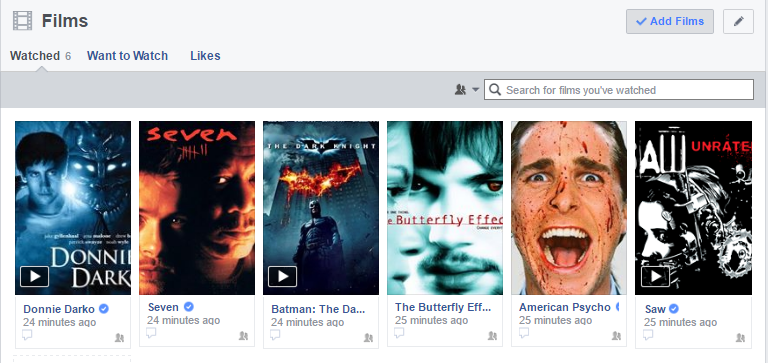 In this slide you can see a list of films my target audience example is interested in. This is significant as the films shown in the list are all those that have the common theme of thriller genre. Two of the films being Butterfly Effect and Donnie darko both have psychological elements as a separate genre.