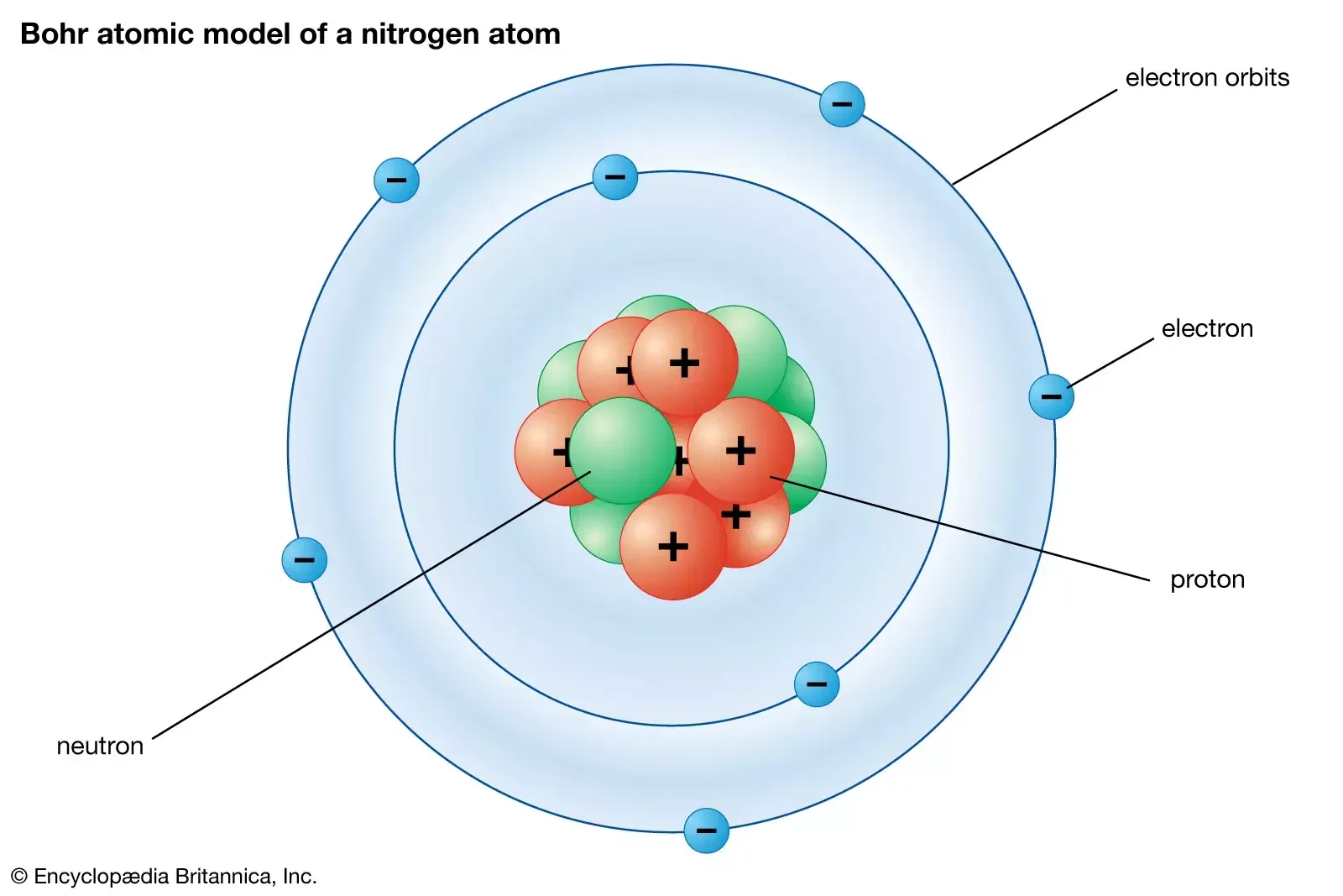 In Bohr's model of the atom, a heavy nucleus containing positively charged protons and neutral neutrons is surrounded by a cloud of negatively charged electrons in definitive states that are sometimes referred to as orbitals. The number of protons determines the type of chemical element.