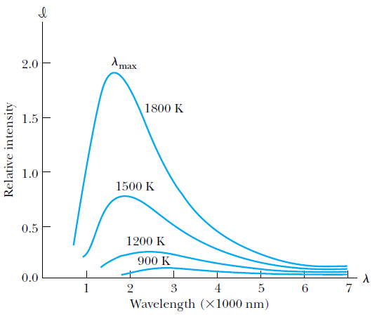 Spectral distribution of radiation emitted from a blackbody for different blackbody temperatures.