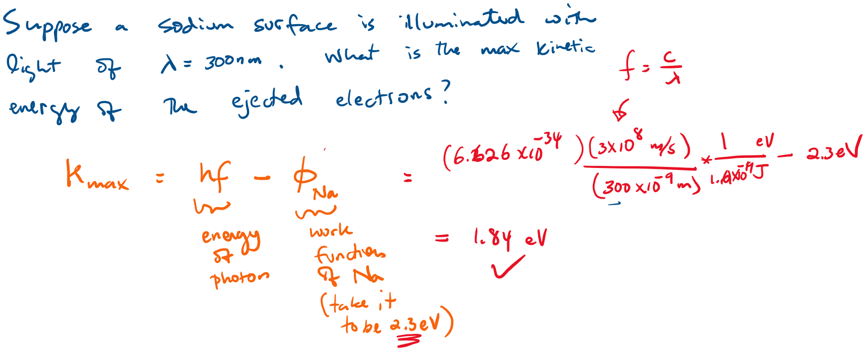 Suppose a Sodium surface is illuminated with light of wavelength = 300 nm. What is the maximum kinetic energy of the ejected electrons?