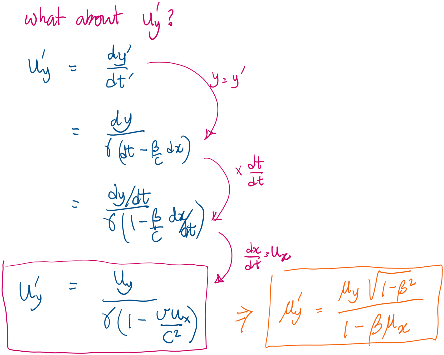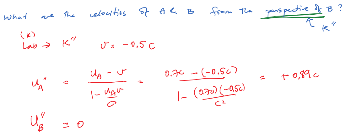 Suppose that we are colliding two particles, A and B, whose speeds in the lab frame are 70% and 50% the speed of light, respectively. Describe the motion of the two particles from their respective perspectives. (i.e. calculate their speeds from A's perspective, and then from B's perspective.)