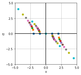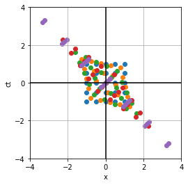 Events are represented by points in the spacetime diagram e=(x,ct).