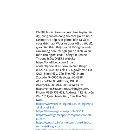 Website: https://one88eucom.mystrikingly.com/. ONE88 là nền tảng ca cược trực tuyến hiện đại, cung cấp đa dạng trò chơi giải trí như casino trực tiếp, slot game, bắn cá và ca cược thể thao. Website được tối ưu tốc độ, giao diện thân thiện và hệ thống