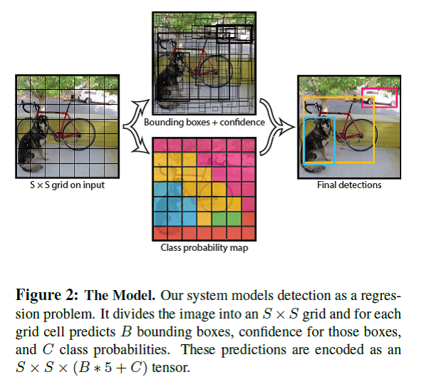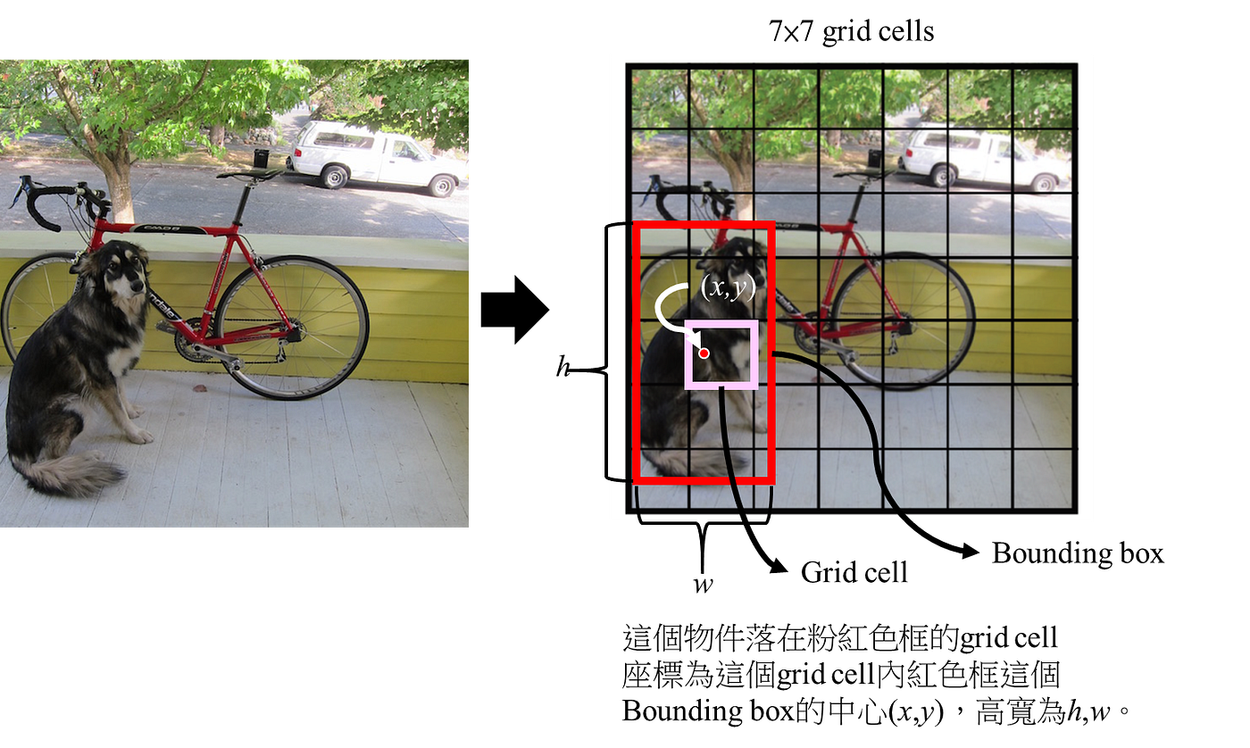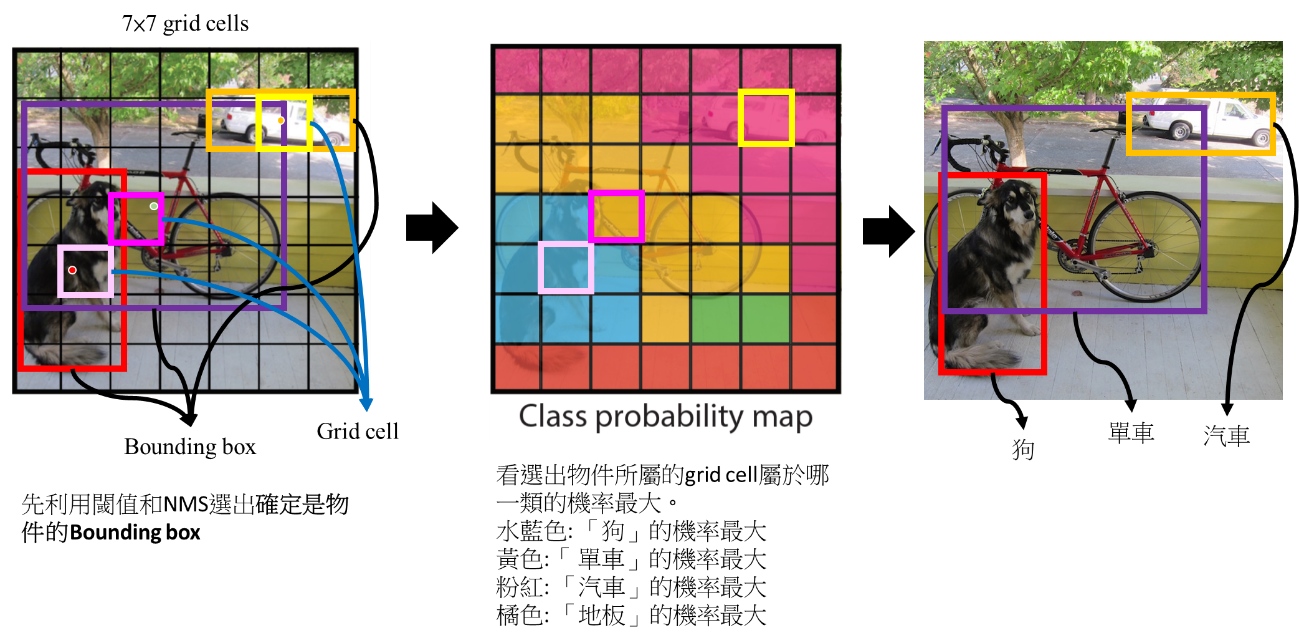 直接以 end-to-end 做物件偵測,利用整張圖片作為神經網路的輸入,直接預測 bounding box 坐標位置、bounding box 含物體的 confidence 和物體所屬的類別。