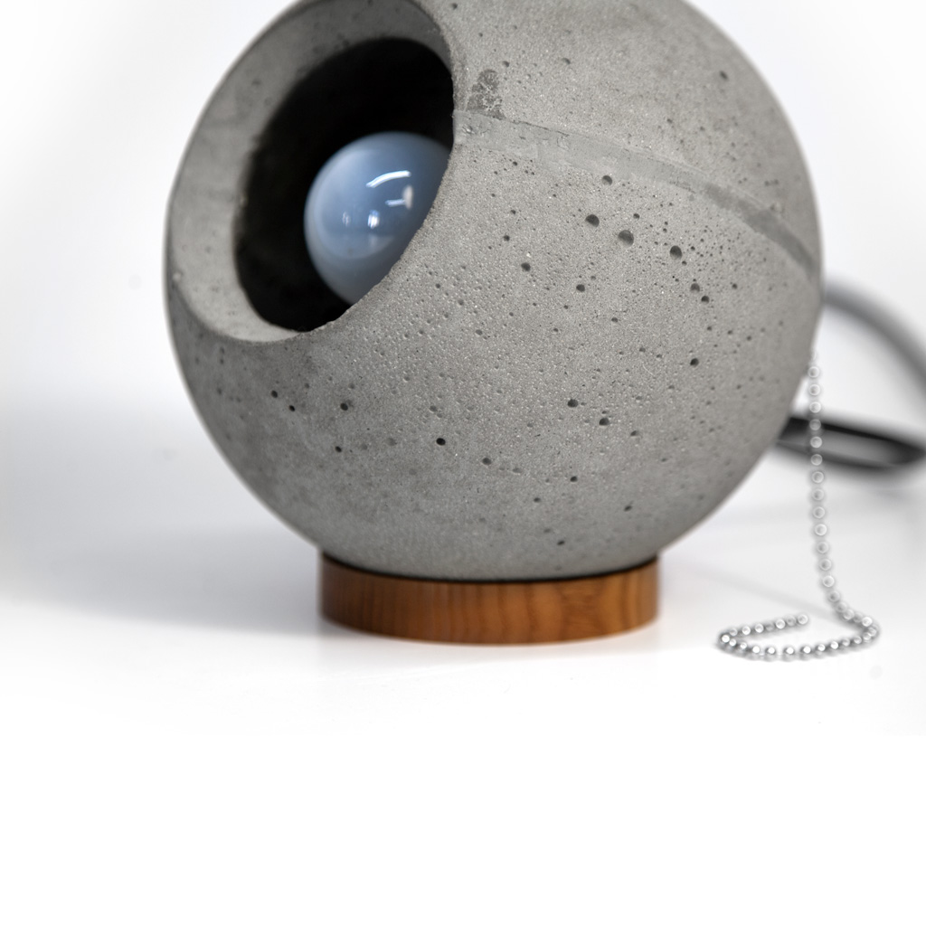 Настольный светильник LOONA. Название светильника говорит за себя – неоднородная текстура бетона, со своими кратерами, напоминает поверхность луны. Такой светильник футуристично выглядит и создает интересную атмосферу в помещении. Плафон на подставке из дуба, можно поворачивать в любом направлении.
