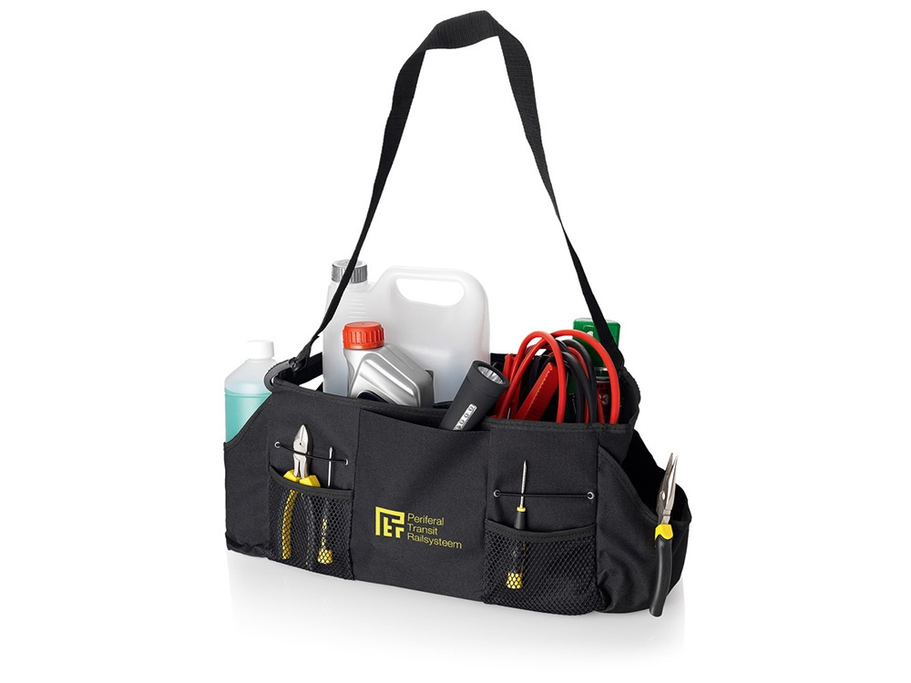 Органайзер для багажника. Внутренний разделитель позволяет сделать два или одно отделение внутри. Пять внешних отделений. Внешние липучки позволяют фиксировать органайзер в багажнике или на ковриках салона. Полиэстер 600D.