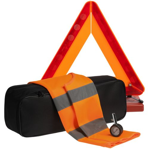 Набор автомобильных инструментов помещен в полиэстерную сумку, которая благодаря своей форме может использоваться в качестве предупреждающего треугольника.
