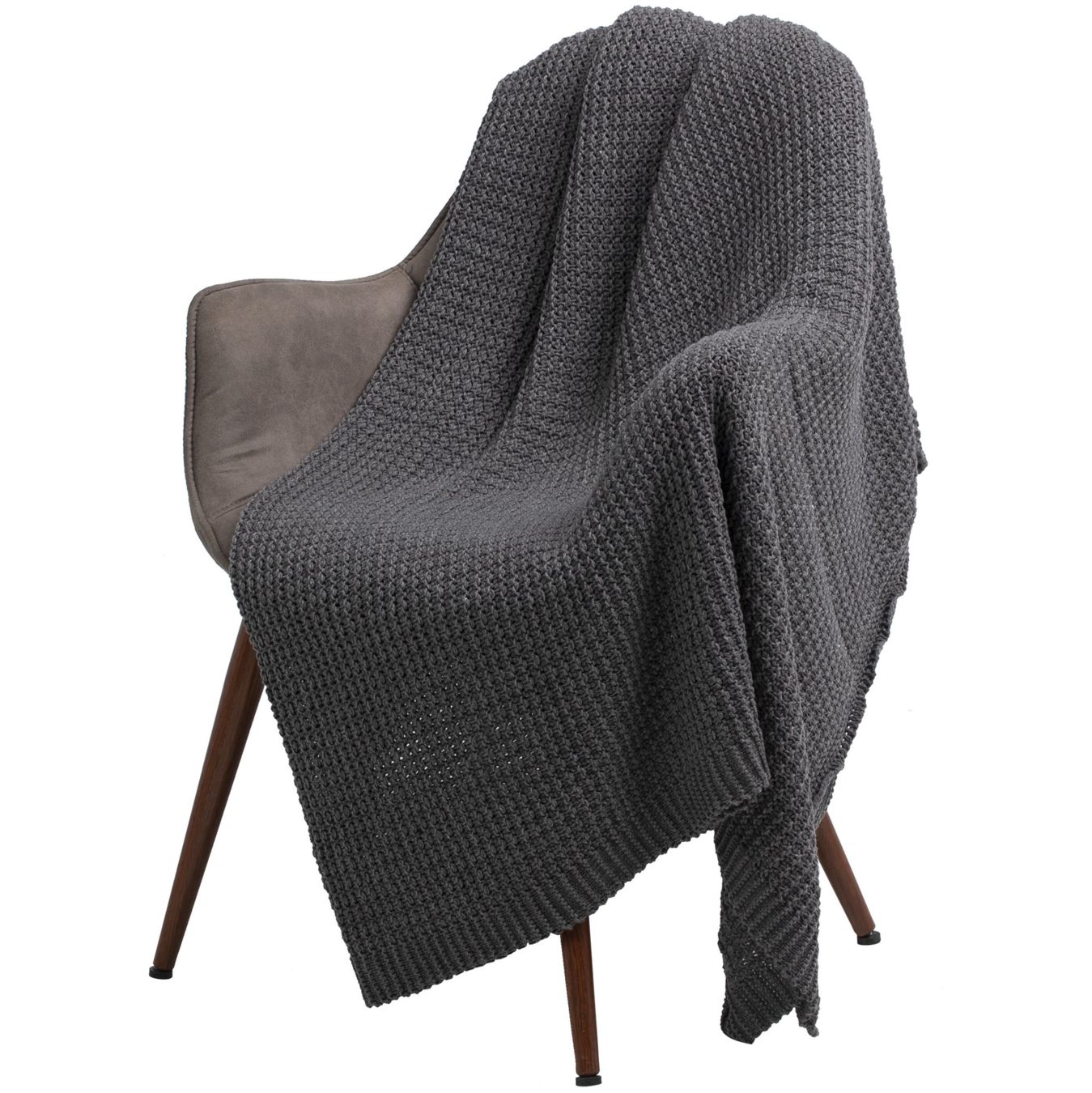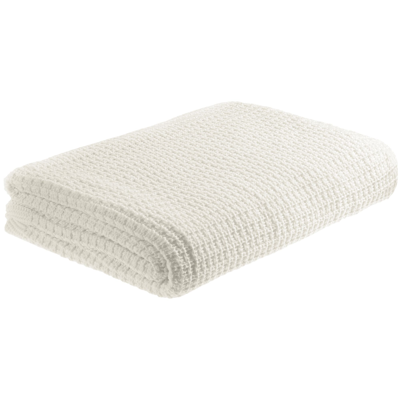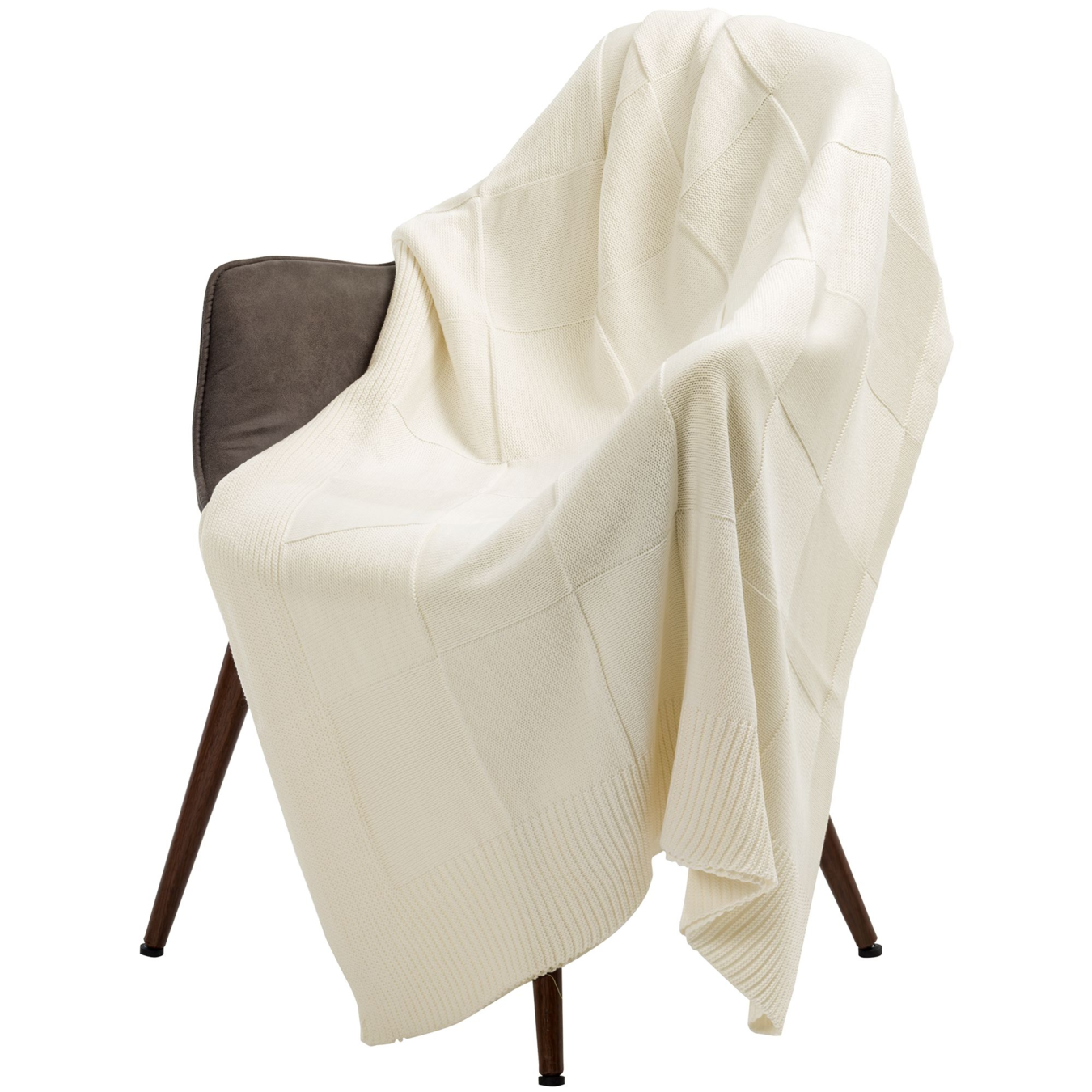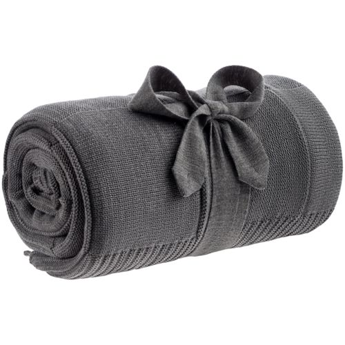 Однотонный плед рельефной вязки «в клеточку» с широким кантом, выполненным резинкой.