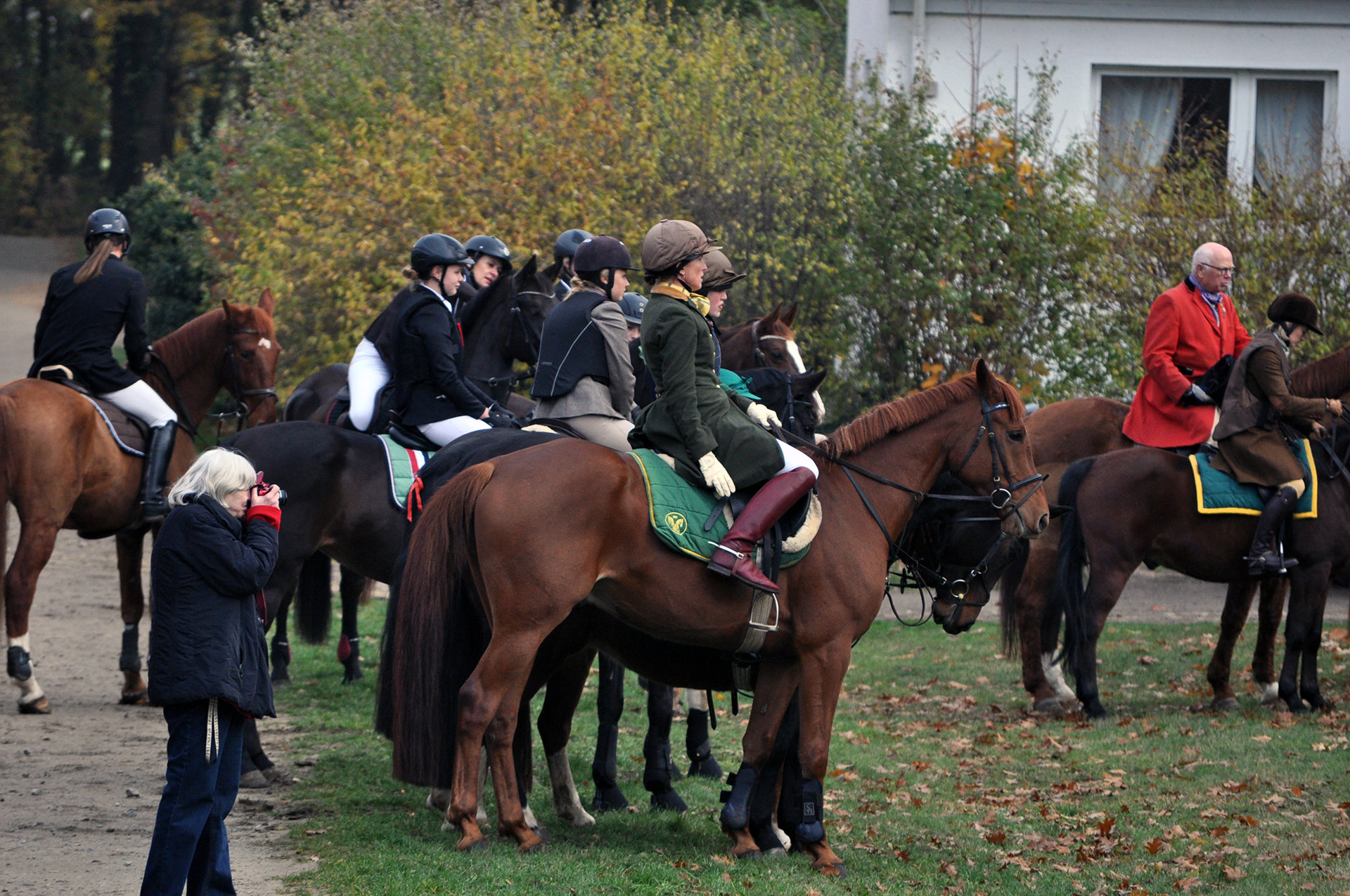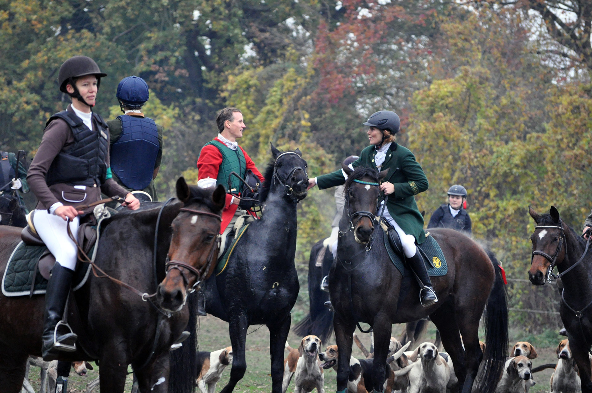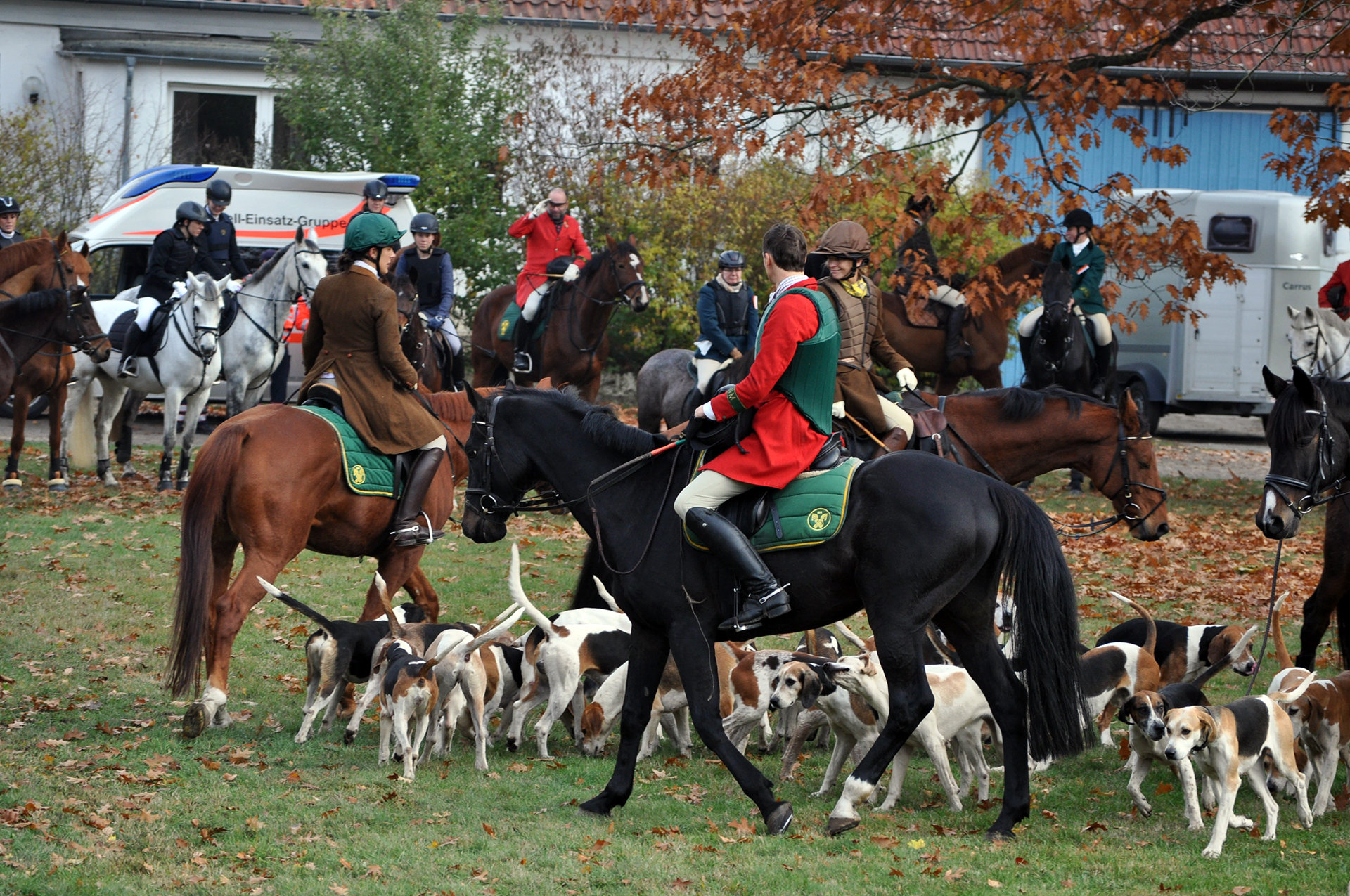 Im großen Halbkreis versammeln sich die Reiter mit ihren Pferden. Die Equipage, der Master und die Pikeure, halten die 23 Foxhounds noch zurück. Dann ein Handzeichen. 23 Hunde stürmen los, diesmal nur ein paar Meter, bis zum Rinderpansen, um den sie sich balgen. Verdiente Belohnung für die Niedersachsenmeute, letztes Signal der Bläser: „Jagd vorbei“.