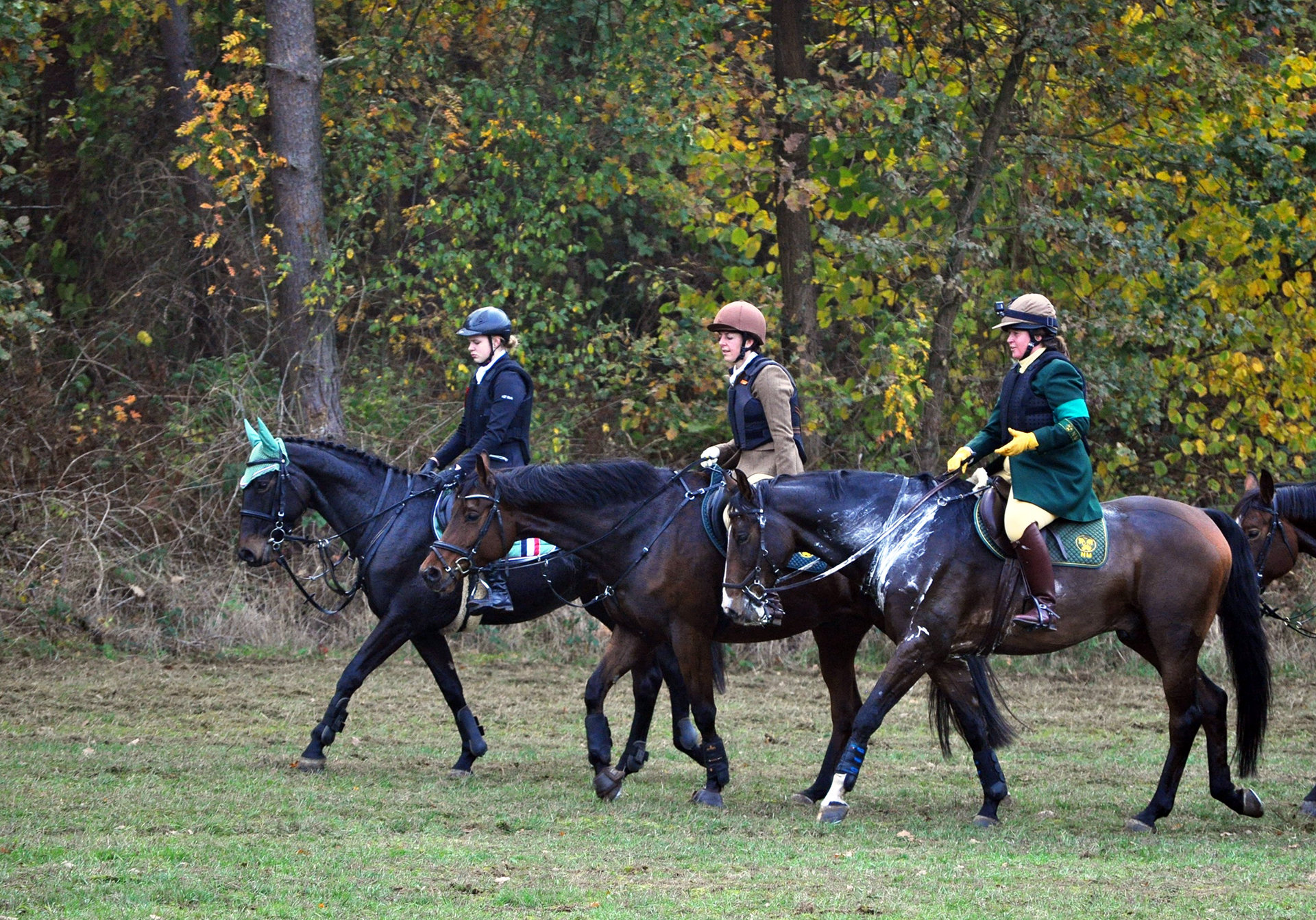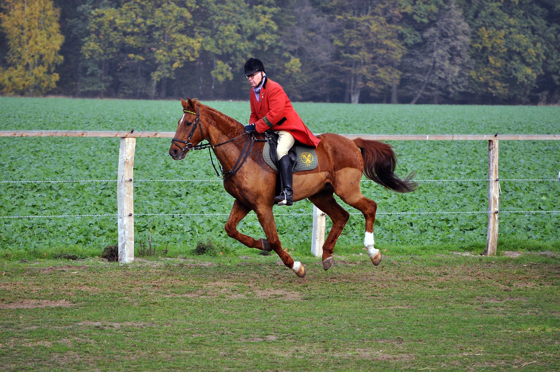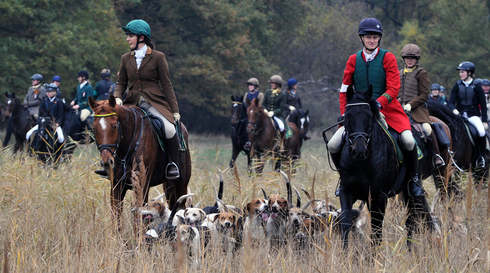 Nur führt sie nicht zur Wildsau. Die gibt es nämlich gar nicht. Bei dieser Herbstjagd stirbt kein Wild, fällt kein einziger Schuss. Die Hunde folgen einer Spur aus Anislösung, gelegt von zwei Reiterinnen. Anne Henne und Katrin Badenhop-Klatte. Diese Jagd ist eine Schleppjagd.