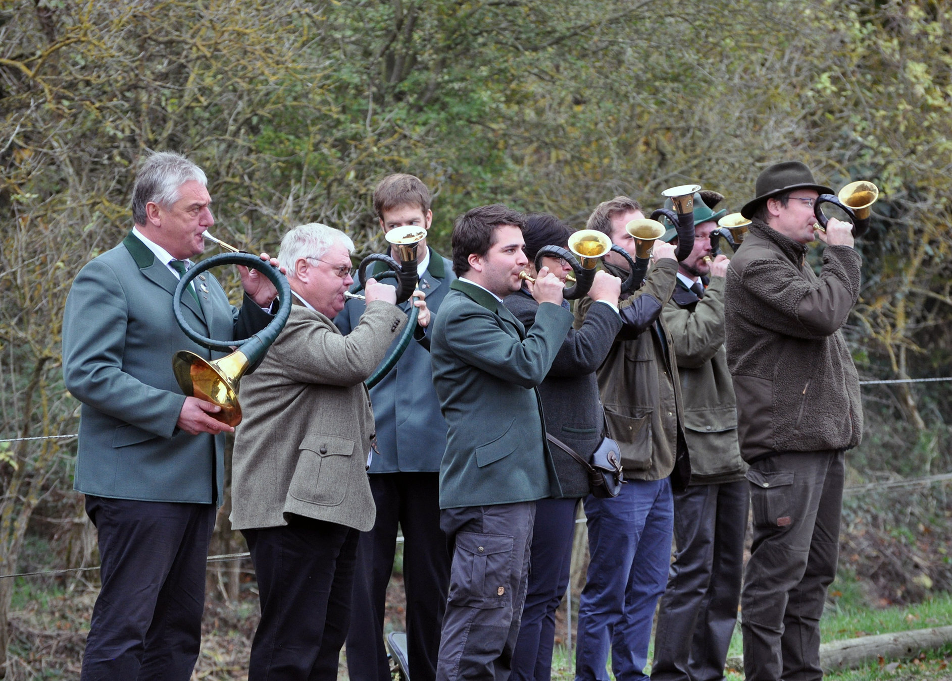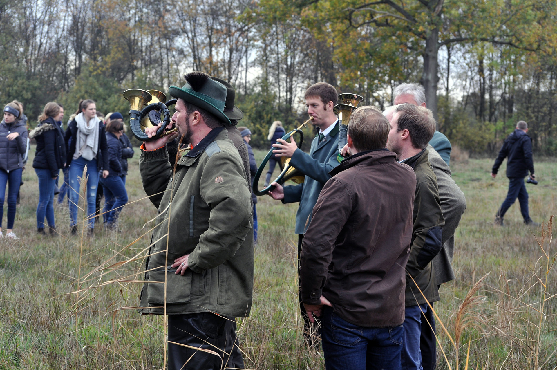 Zeit für das Halali. Die Reiter streifen den rechten Handschuh ab, schütteln sich die Hände, beglückwünschen sich zur erfolgreichen Jagd. Der Master übernimmt die Regie, lässt absitzen. Die Bläsergruppe stimmt das „Halali“ an.