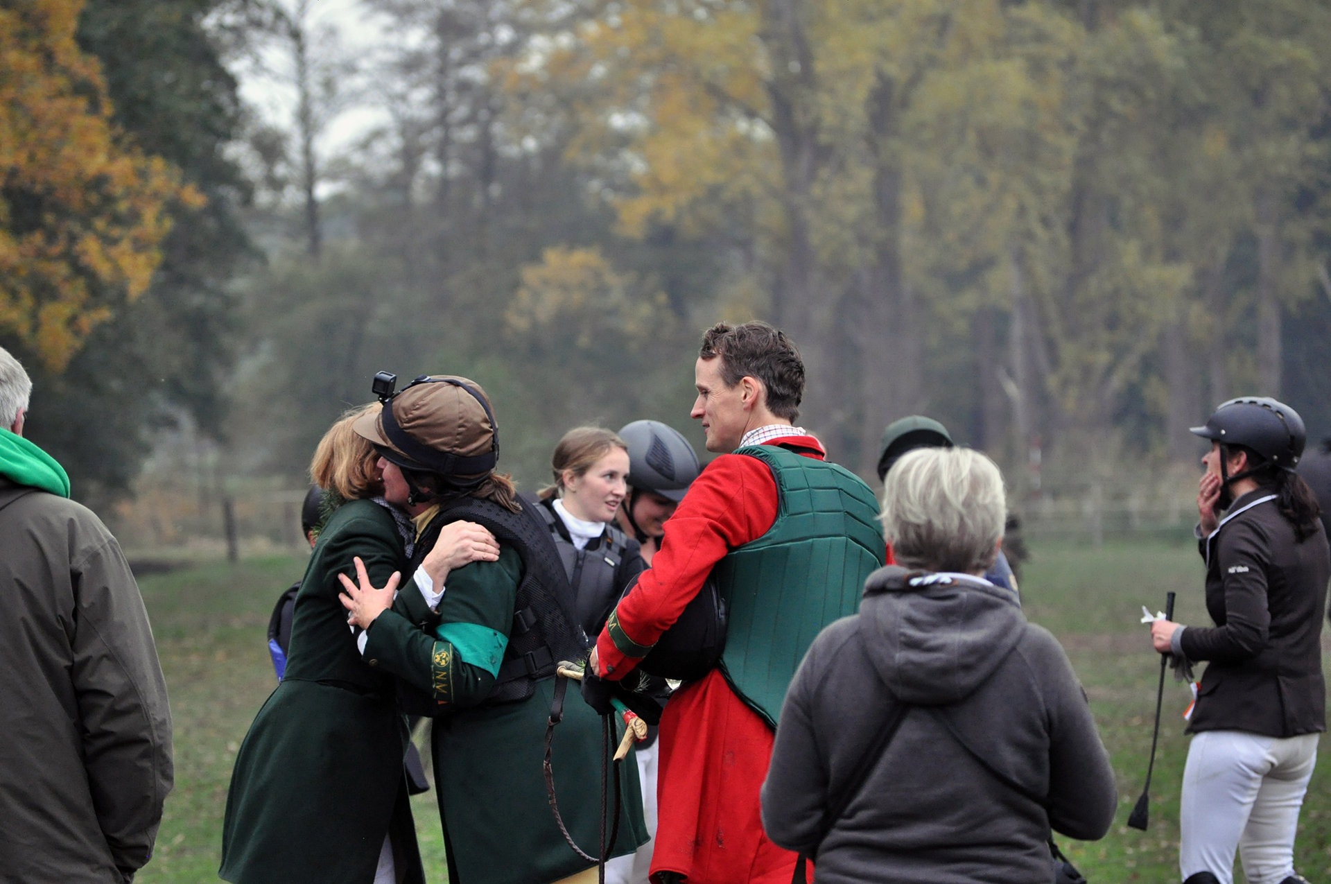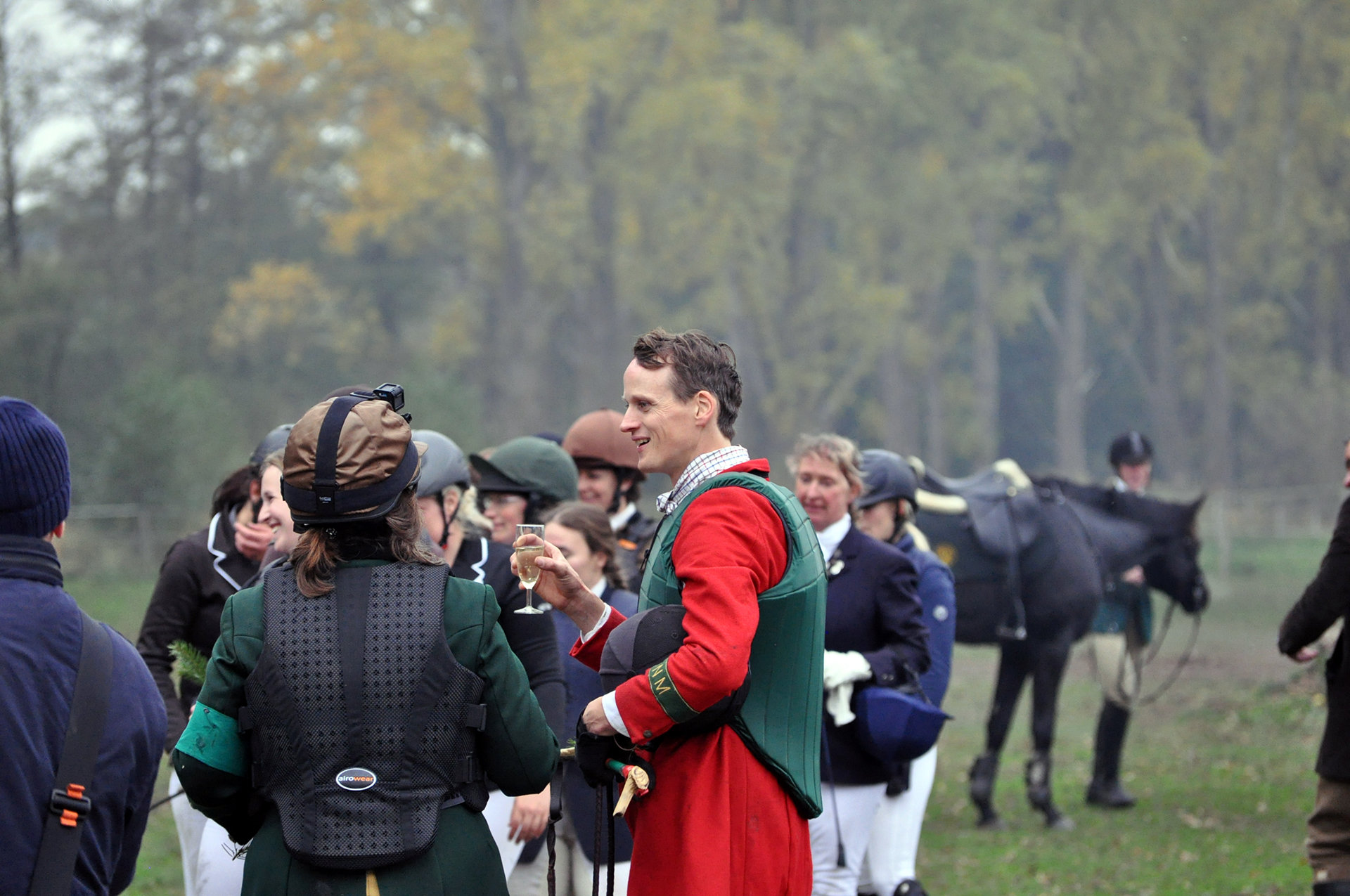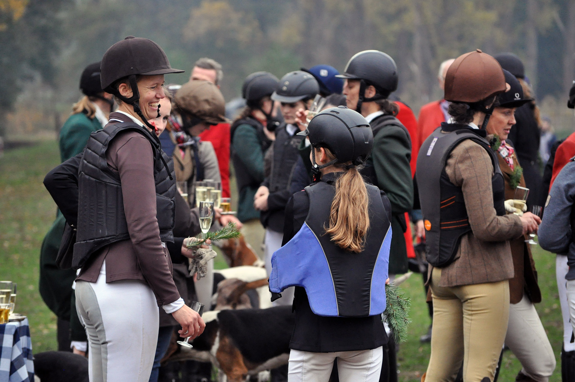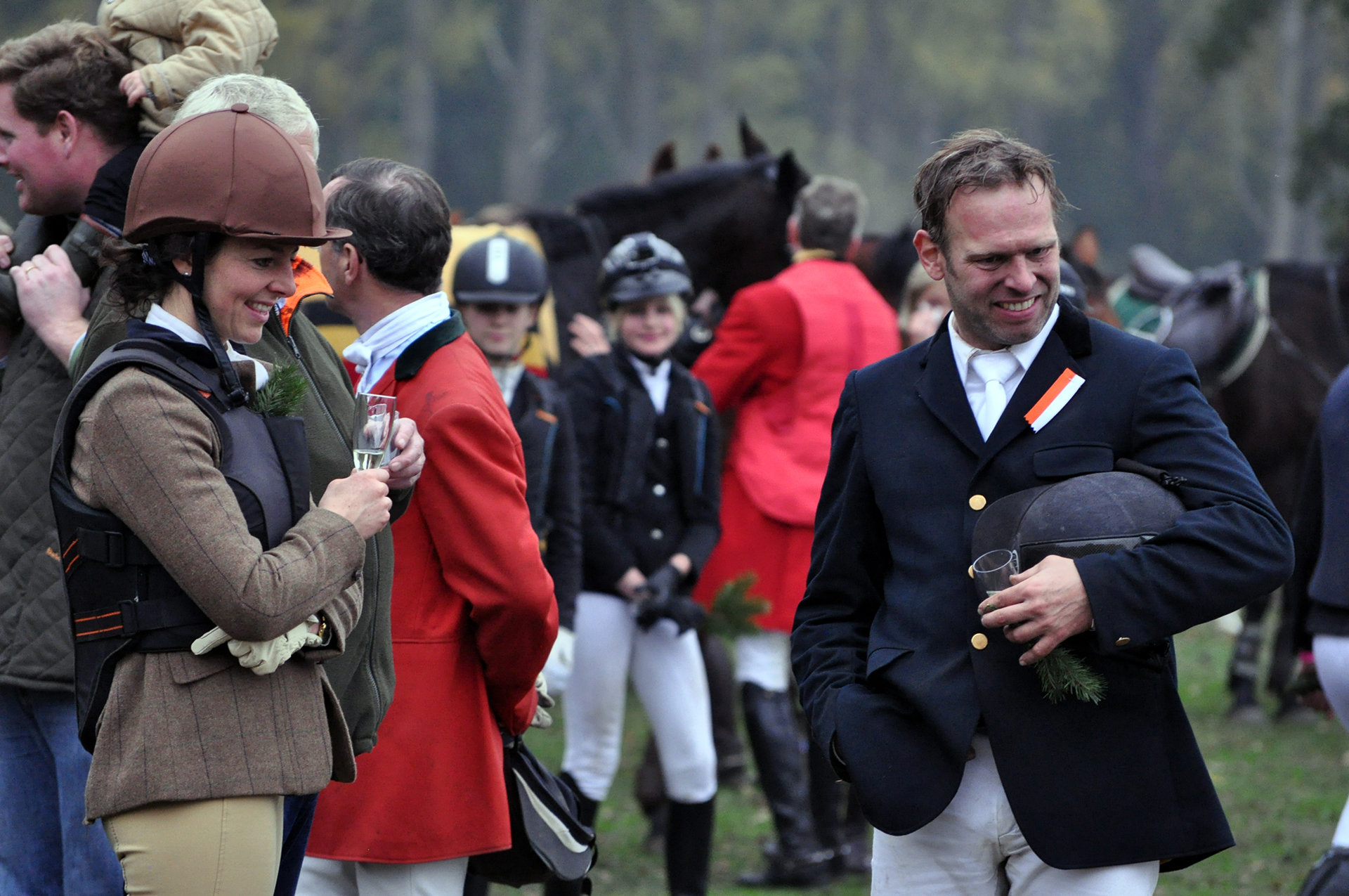 Die Jagdherrin verteilt den Bruch an die Reiter. Ein kleiner Fichtenzweig, Jagdtradition eben. Dazu gibt es ein Gläschen Sekt, Küsschen und Umarmungen, herzliche Worte, fast familiär. Nicht nur fast. „Jagdreiten ist eine Passion, wahnsinnig familiär geprägt“, sagt Mechthild von Lucke. „Es ist kein Wettbewerb, es gibt keinen Sieger.“