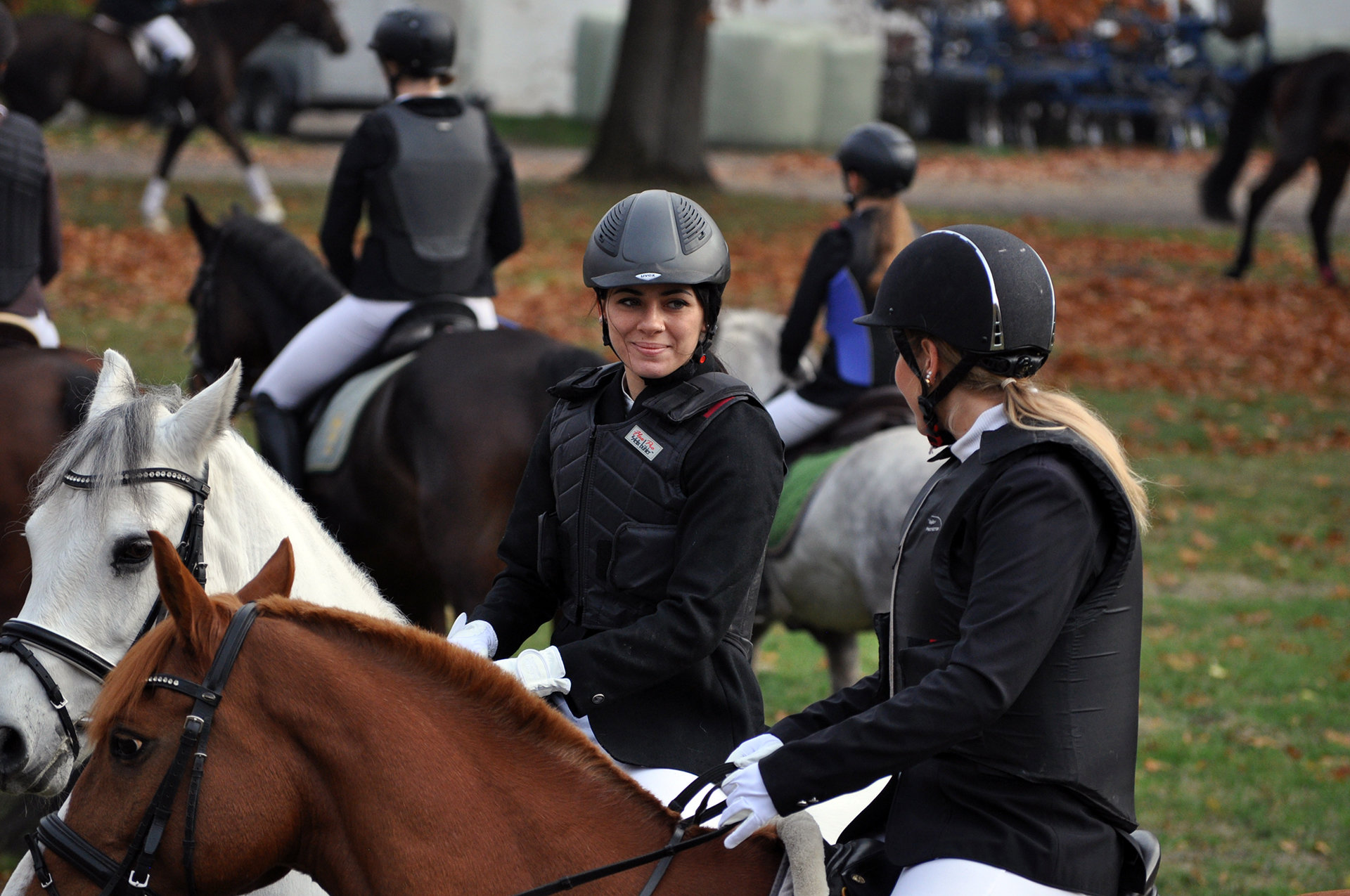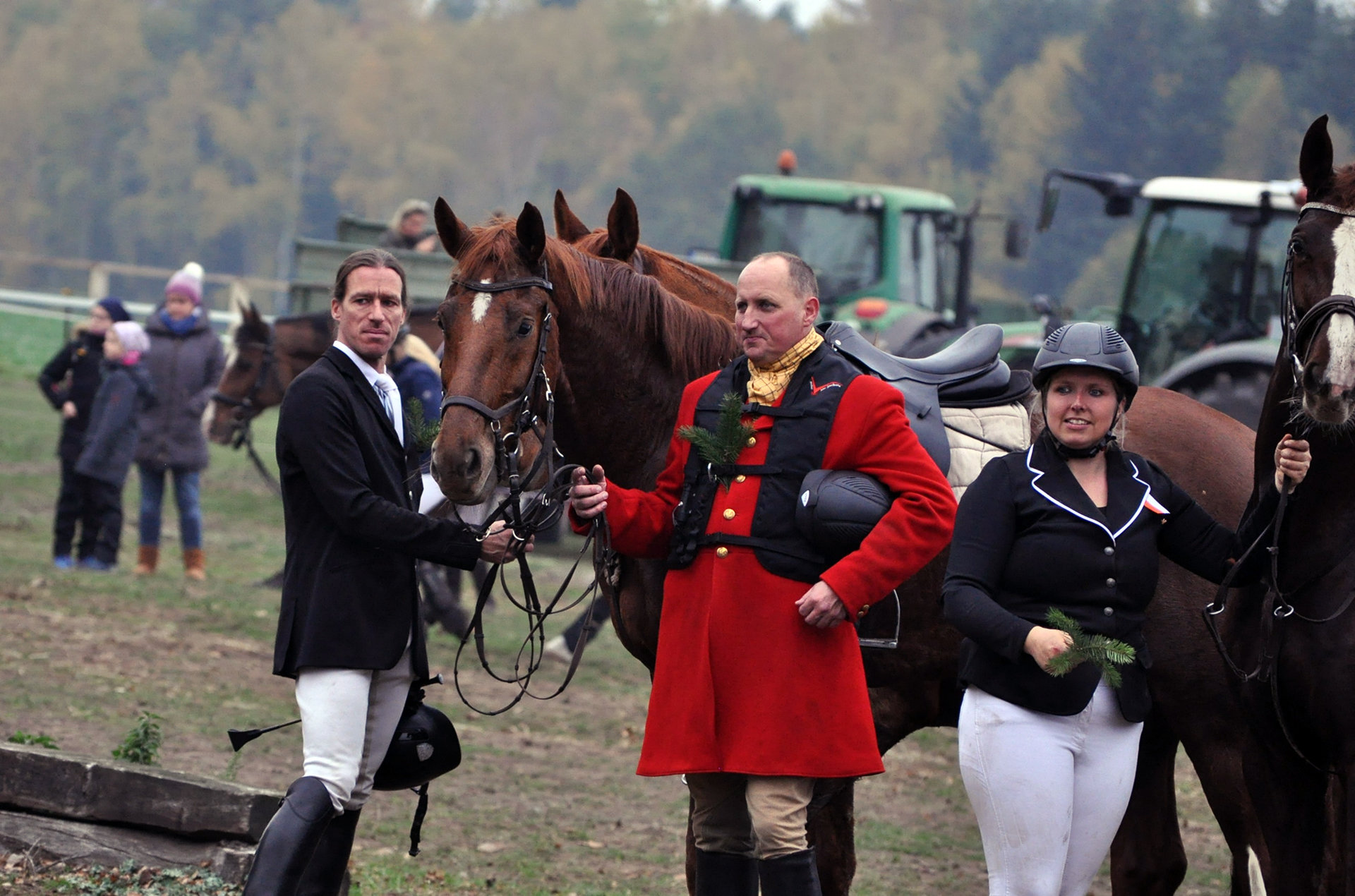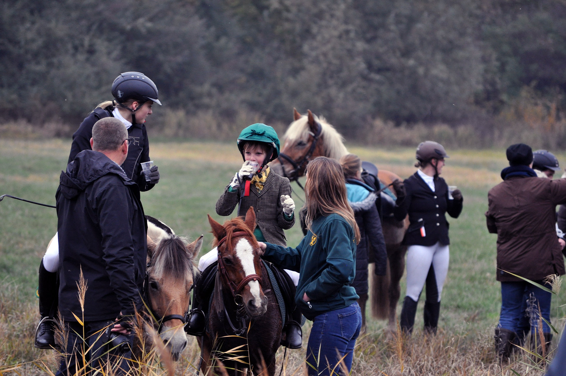 Fast. In der Reithalle wartet auf Reiter und Gäste das Jagdessen. Und die Jagdkritik. Sie fällt gut aus. Für Jule Petersen aus Meine und Joane Methner aus Warxbüttel, beide 12 Jahre alt, wird sie unvergesslich. Die beiden sind ihre erste Schleppjagd geritten, sind stolz wie Oskar und müssen nach vorn kommen. Vor der ganzen Gesellschaft werden sie mit Schleppflüssigkeit beträufelt. Anisgeruch macht sich breit. Dafür gibt’s für die beiden einen Meutebecher als Andenken und Aufmunterung, noch viele Meutejagden zu reiten. So sind sie, die Jagdreiter, eine fröhliche, familiäre Meute!