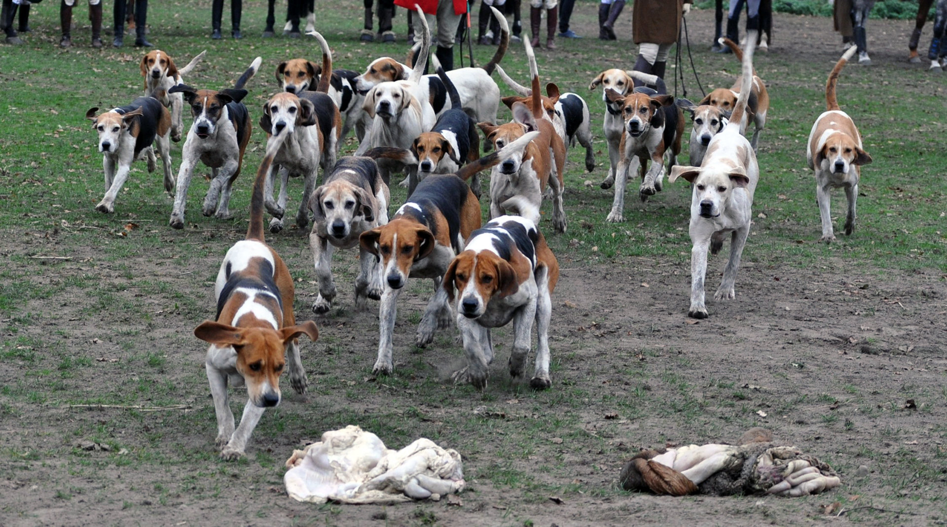 Formation der bei einer Schleppjagd eingesetzten Hunde.
