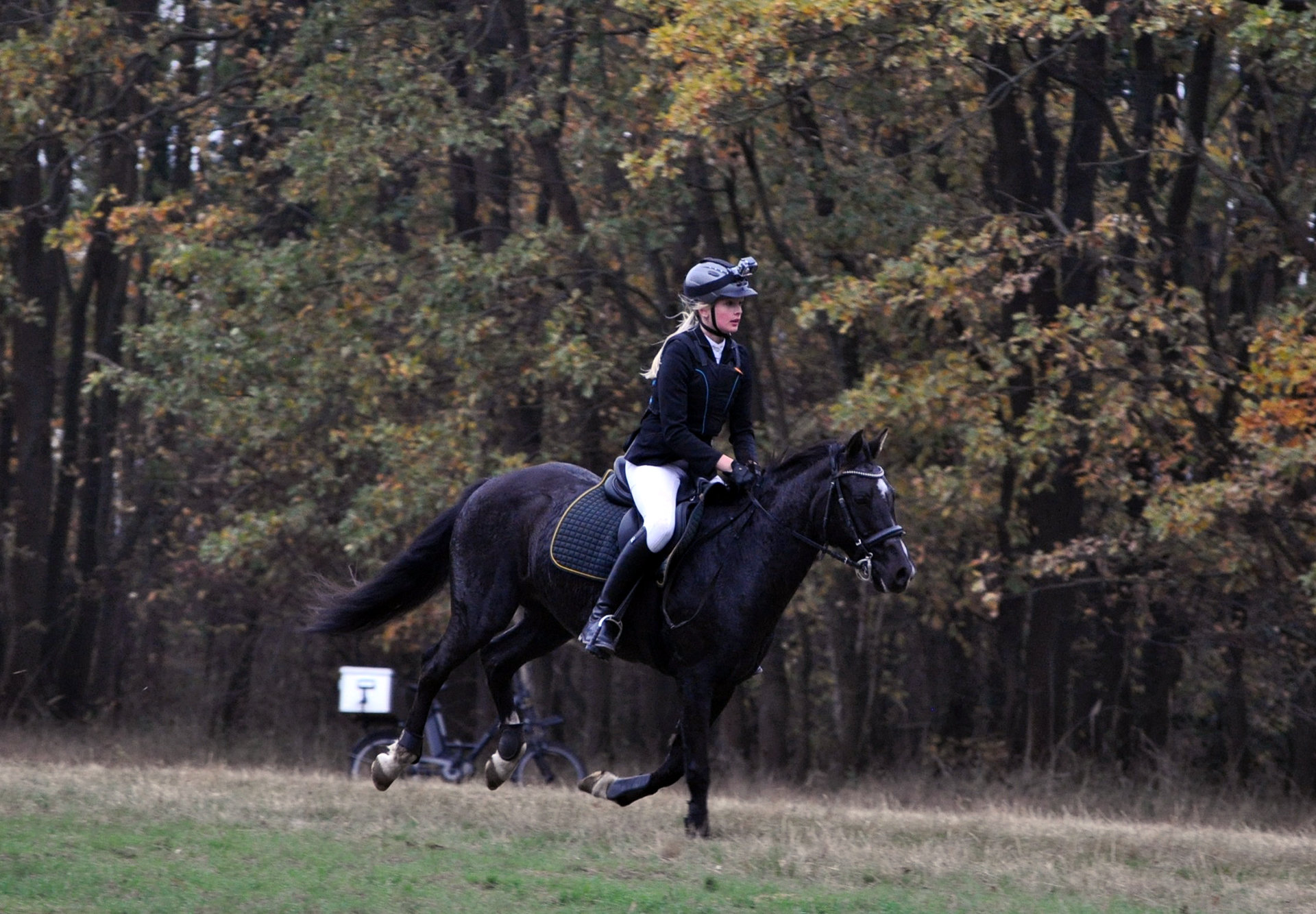 Gleich hinter der Equipage, dem Master und den Pikeuren reitet Silke Brebeck aus Hamburg. Mit ihrem selbst gezogenen achtjährigen Hannoveraner Wallach Magic Moods. Sie führt die springende Abteilung an, trägt für alle erkennbar eine grüne Armbinde – und eine Helmkamera.