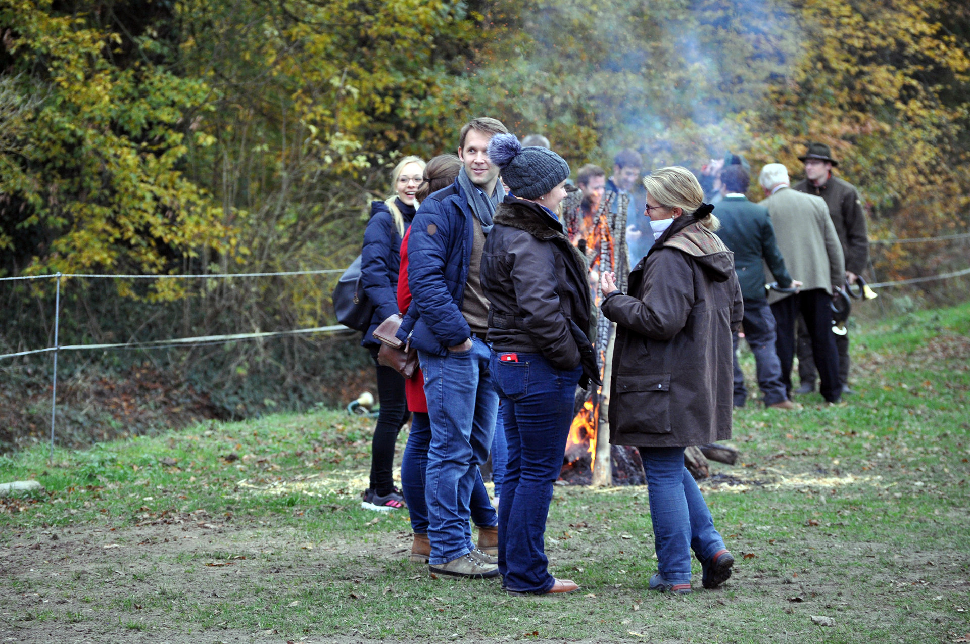 Die Fahrt geht zurück Richtung Gut Warxbüttel. Auf einer Wiese lodert ein Lagerfeuer, ein kleiner Tisch mit Sektgläsern steht bereit. Hermann Niebuhr wartet mit der Bläsergruppe des Hegerings Schwülper. Aus der Ferne ist das Hundegebell zu hören. Die Meute kommt über das kurze Gras geflogen, dahinter der Master, die Pikeure, die Reiter. Durchatmen. Alle sind wohlauf. Entspannung in den verschwitzten Gesichtern. Sie loben ihre Pferde, streichen über die Mähne, den Hals.