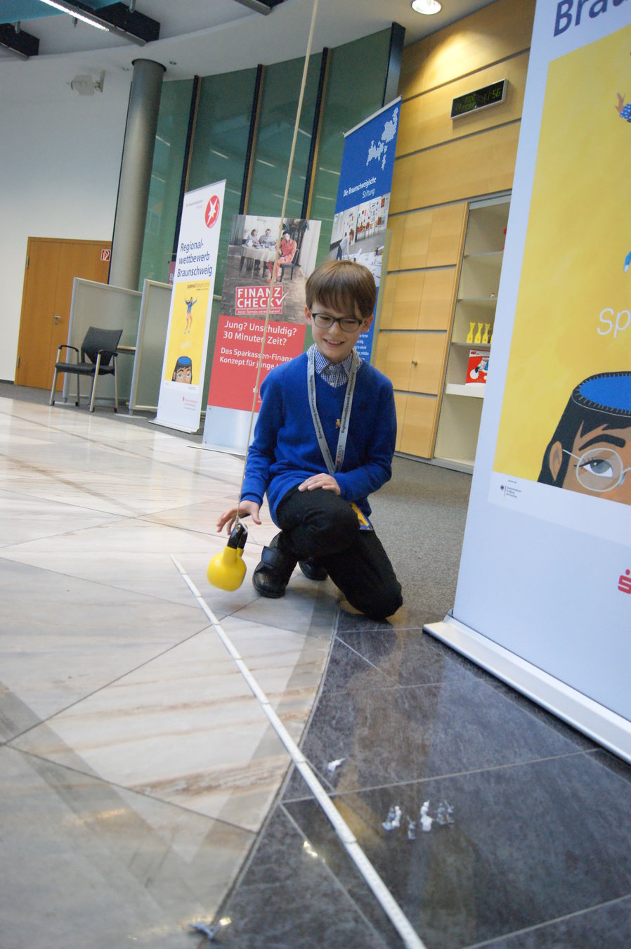 Braunschweig. Im Treppenhaus hat Linus seinen Versuch das erste Mal ausprobiert. Der Zehnjährige steht etwas verloren in der Lobby des Sparkassengebäudes und schaut auf den Boden. Während alle anderen Schüler ihre Experimente auf der Galerie im ersten und zweiten Stock aufgebaut haben, steht der junge Schüler ganz alleine im Erdgeschoss. Das Pendel, das vom Geländer herunter bis wenige Zentimeter über den Boden hängt, braucht eben etwas mehr Platz - und vor allem Höhe. Die Erde ist eine Kugel, die sich dreht, das möchte Linus beweisen.