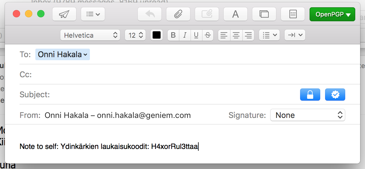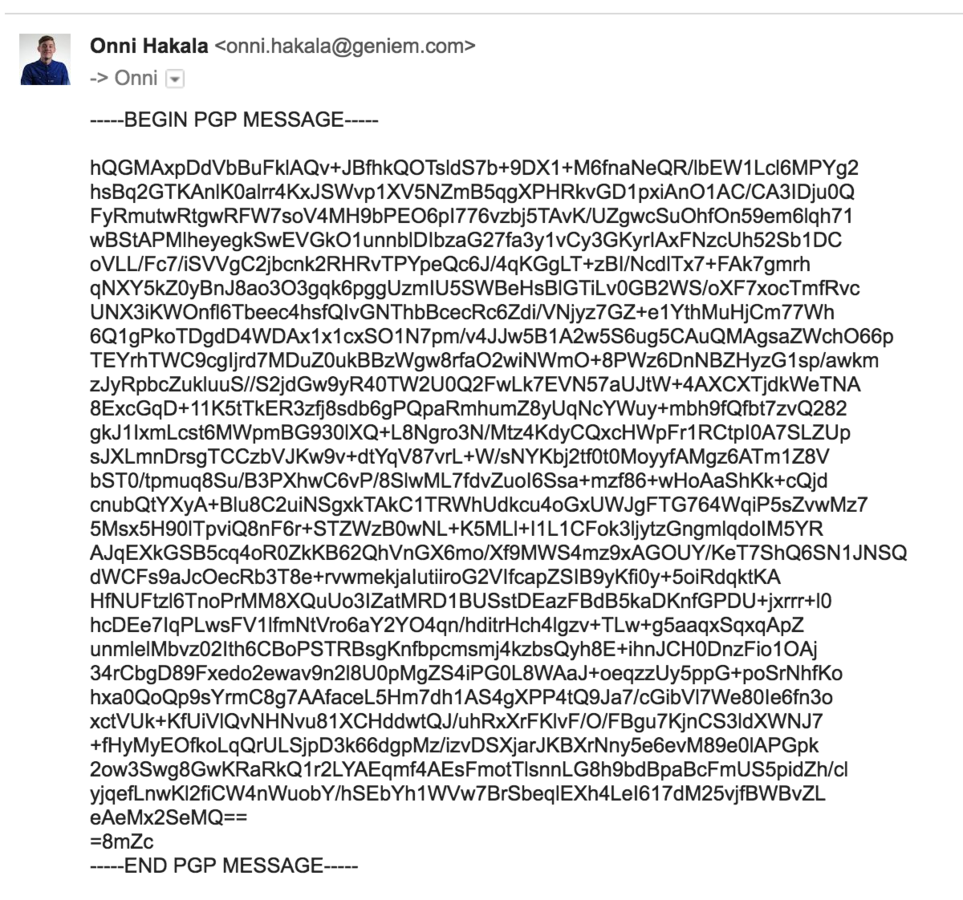 $ echo "Moi Onni!" | gpg -a --encrypt --sign --recipient onni.hakala@geniem.com