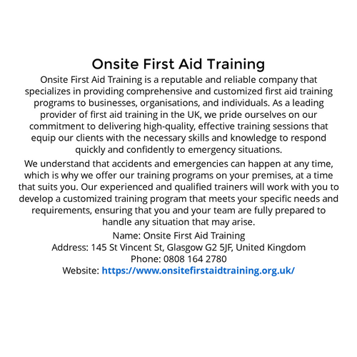 https://www.onsitefirstaidtraining.org.uk/ Onsite First Aid Training is a UK-based company which offers bespoke & thorough first aid training programmes to individuals, organizations, & businesses.