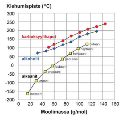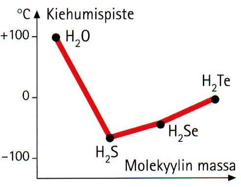 Happiryhmän alkuaineiden kiehumispisteet kuvassa. Veden kiehumispiste poikkeaa merkittävästi saman ryhmän muiden alkuaineiden vastaavasta linjasta.