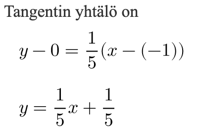 sen pisteeseen (-1, 0) piirretyn tangentin yhtälö.