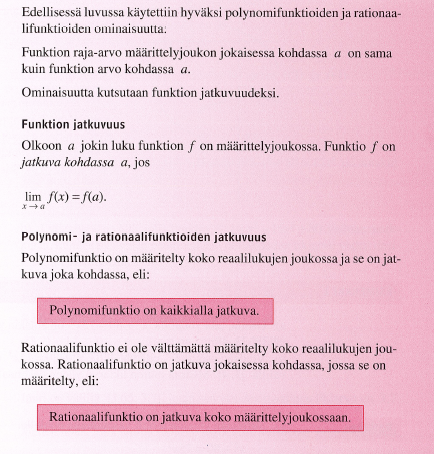 • osaa määrittää rationaalifunktion nollakohdat ja ratkaista yksinkertaisia rationaaliepäyhtälöitä • omaksuu havainnollisen käsityksen funktion raja-arvosta, jatkuvuudesta ja derivaatasta