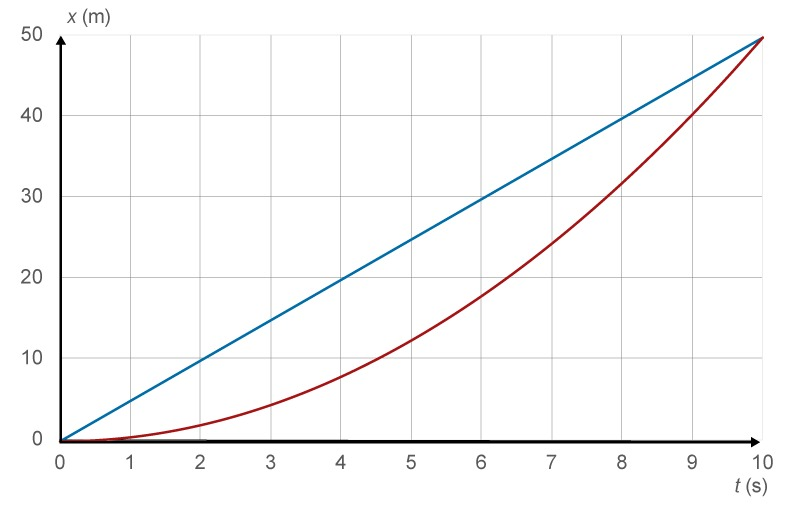 Kuvaajassa on esitetty kahden moottoripyörän paikan kuvaajat. Mitä voidaan sanoa liikkeiden nopeuksista?